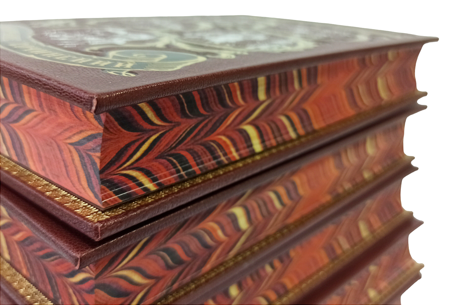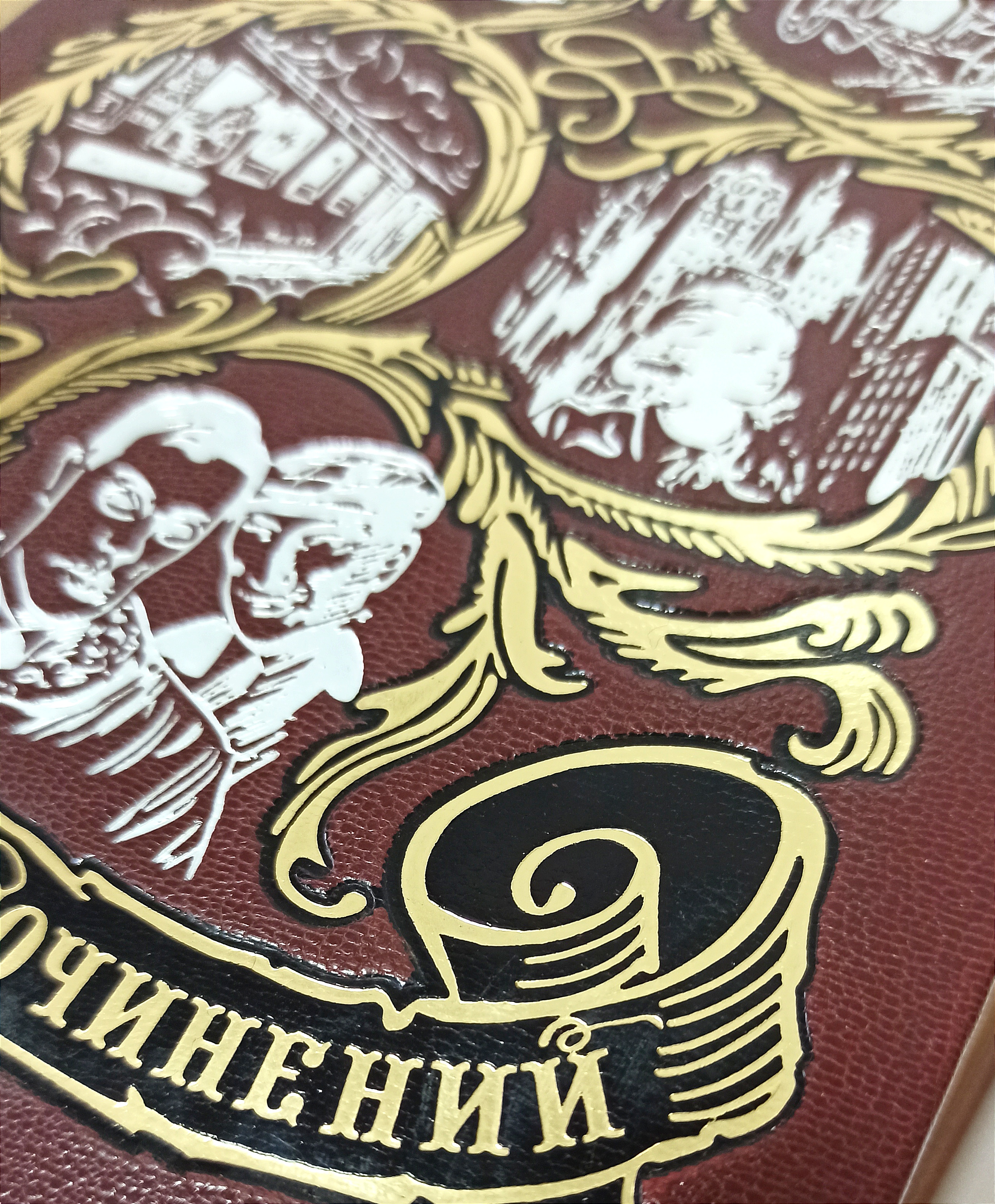 Цельнокожаный переплёт из натуральной шагрени, ручной работы, украшен цветной кожаной вставкой, а также серебряным и золотым тиснением.