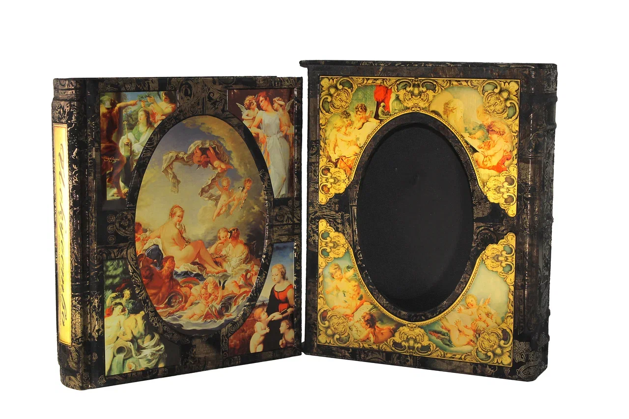 Цельнокожаный переплёт ручной работы, украшен иллюстрированной вставкой из цветного металла.