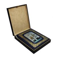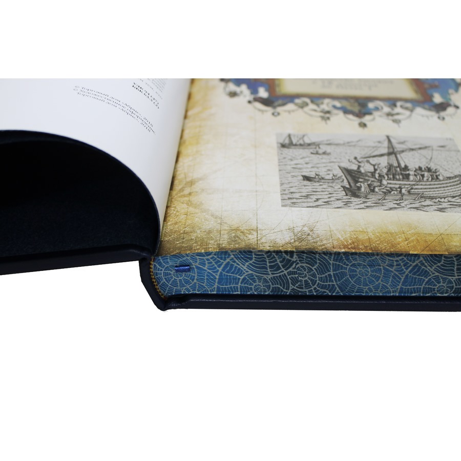 Дизайн прекрасно сочетает в себе золотое и блинтовое тиснение, художественную металлическую вставку, соответствующую тематике издания, а также крашенный в тон переплетного материала обрез.