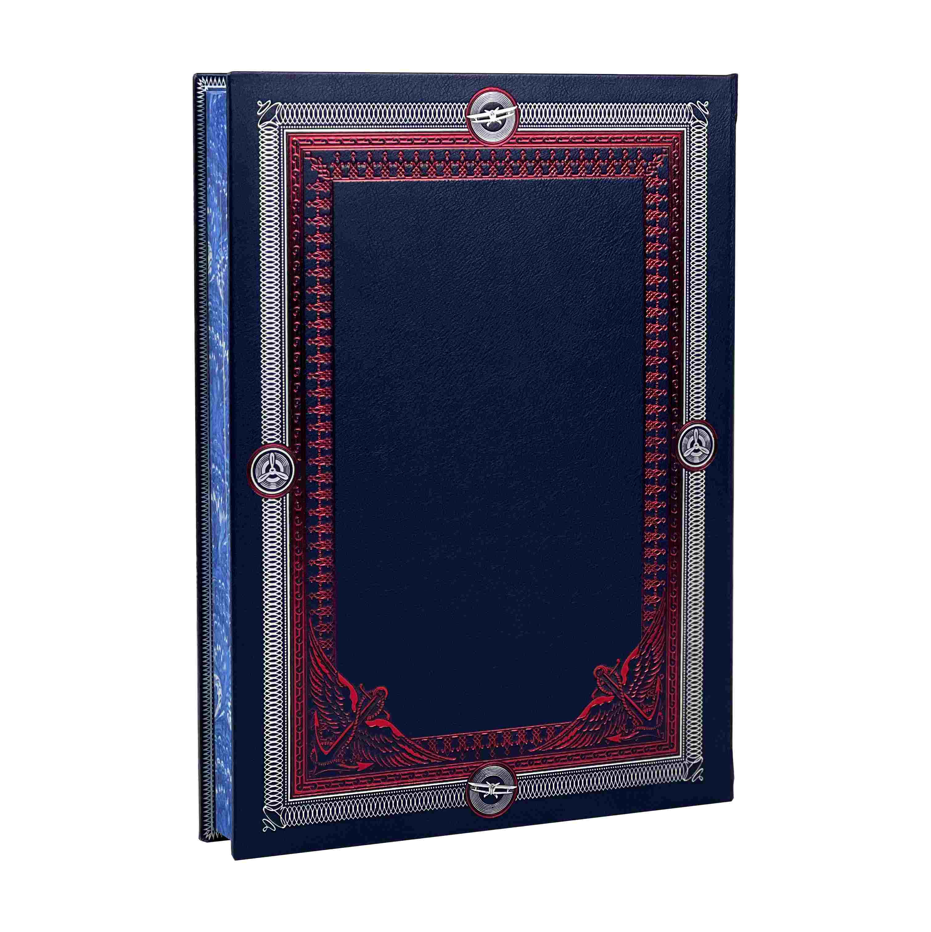 Подарочное издание в 2-х томах, каждая книга которая представлена в цельнокожаном переплете ручной работы, включает в своем дизайне сочетание серебряного и красного тиснения, выполненных на высококачественной натуральной коже. Деревянная подставка обтянутая натуральной кожей и оформлена серебряным тиснением и цветной шелкографией.