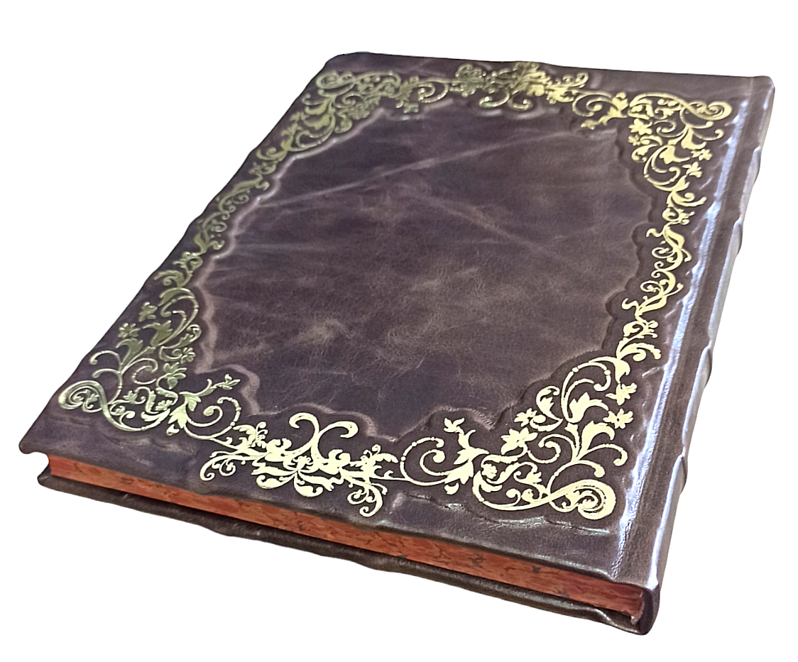 Цельнокожаный переплёт ручной работы, украшен вставкой из цветного металла с золотой печатью.Блинтовое и золотое тиснение.