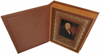 Цельнокожаный переплёт ручной работы, украшен иллюстрированной вставкой из цветного металла.