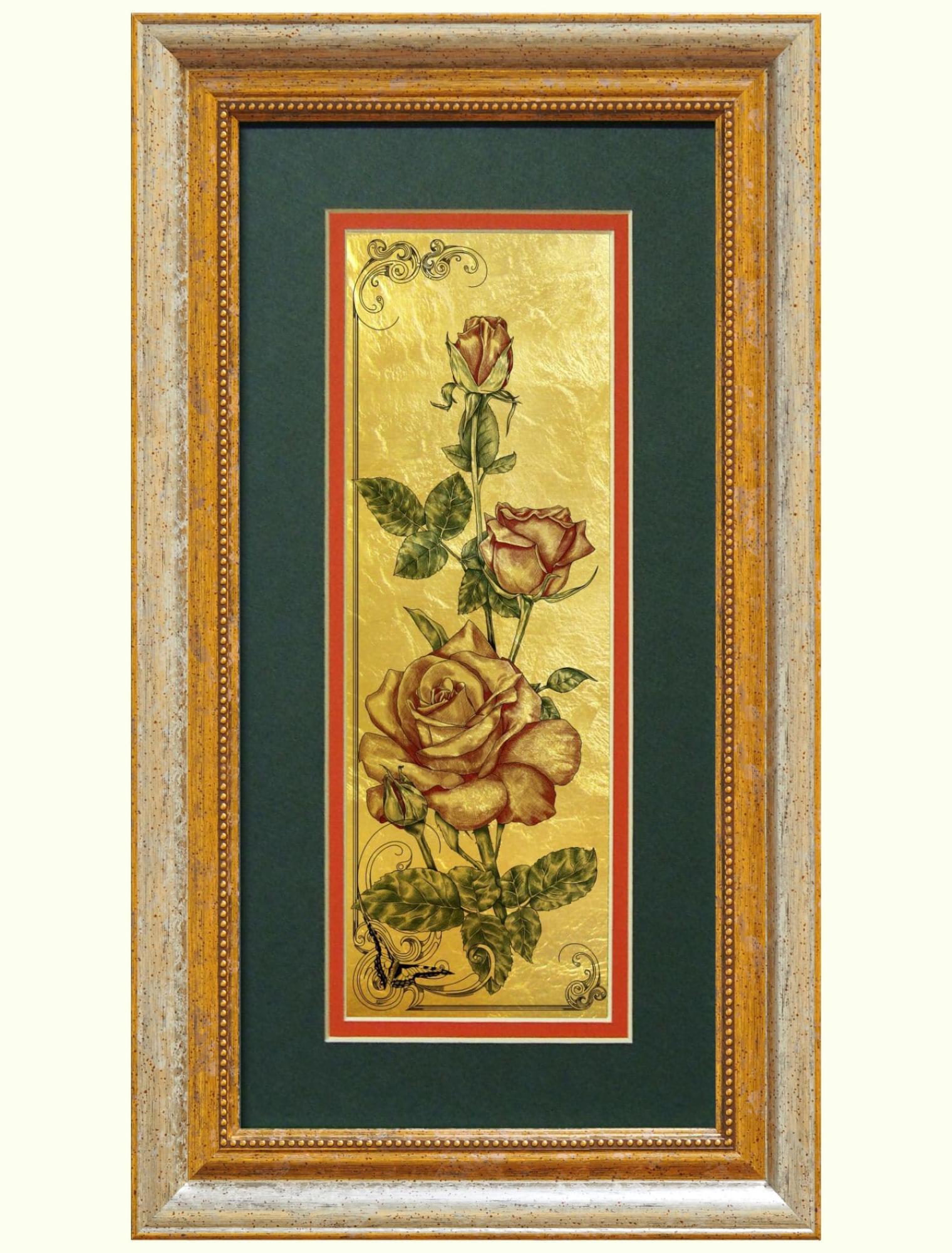 Выполненные из сусального золота, ажурные картины передают неповторимое очарование божественной розы и станут вечным напоминаем о бессмертной любви и благородной доблести.