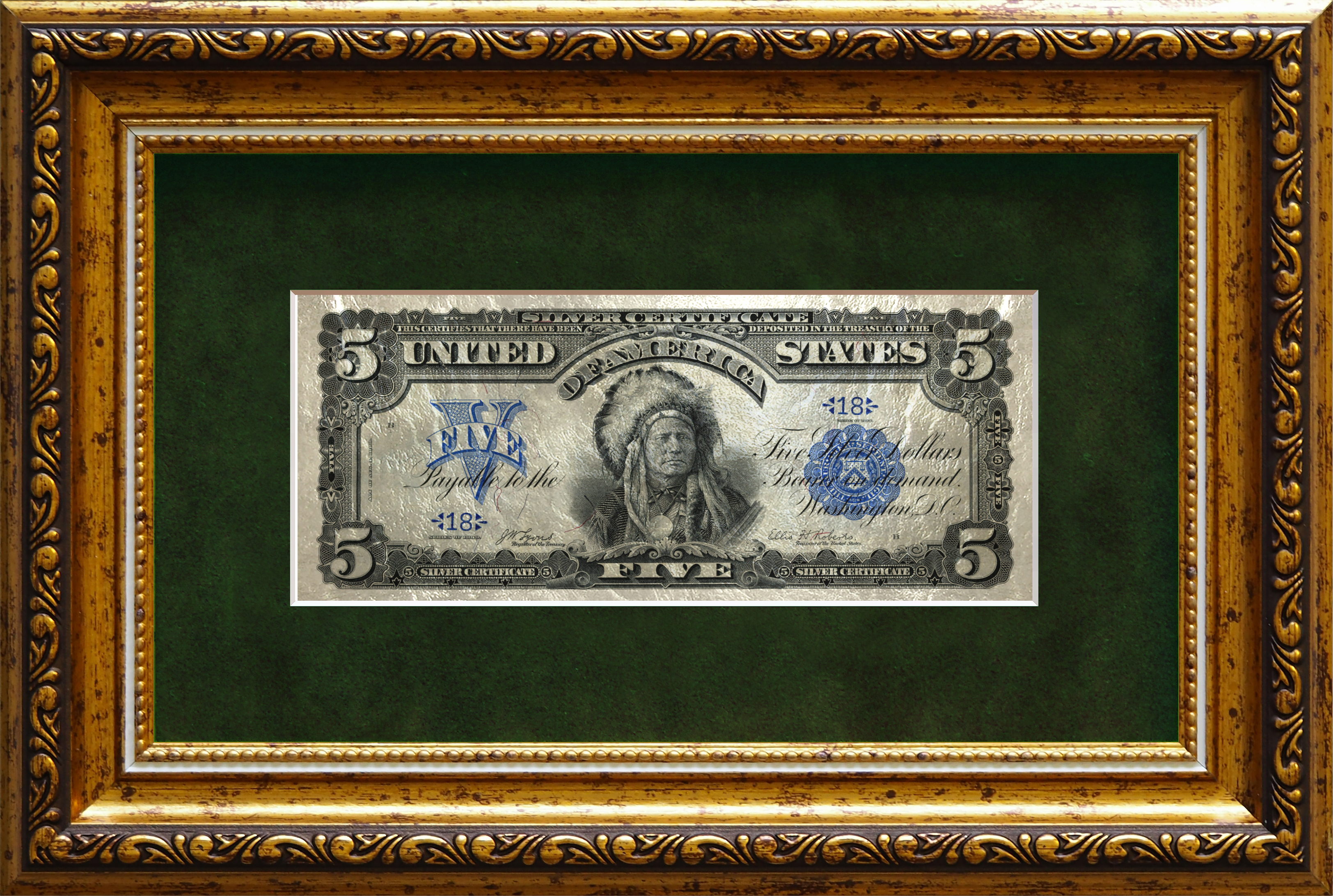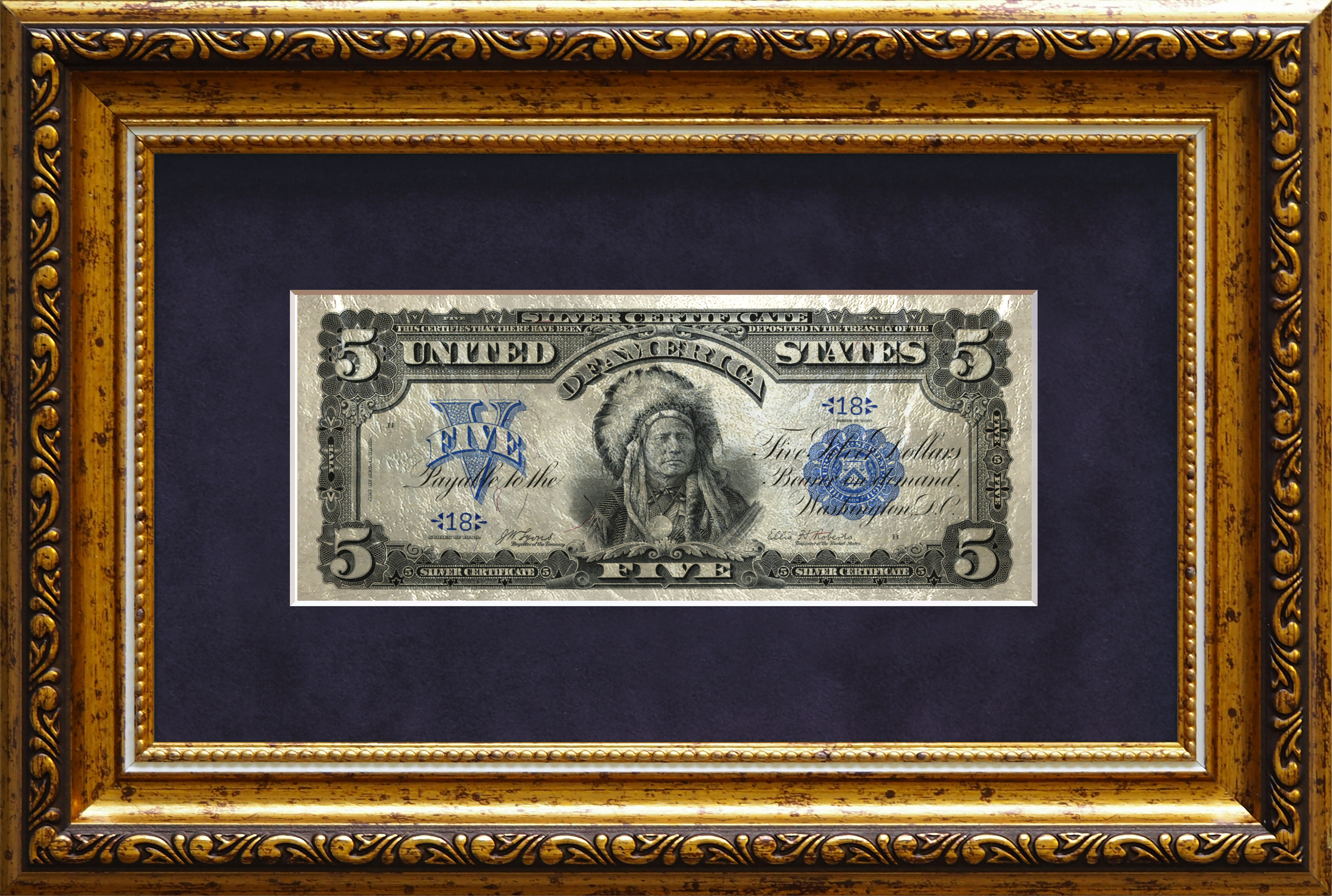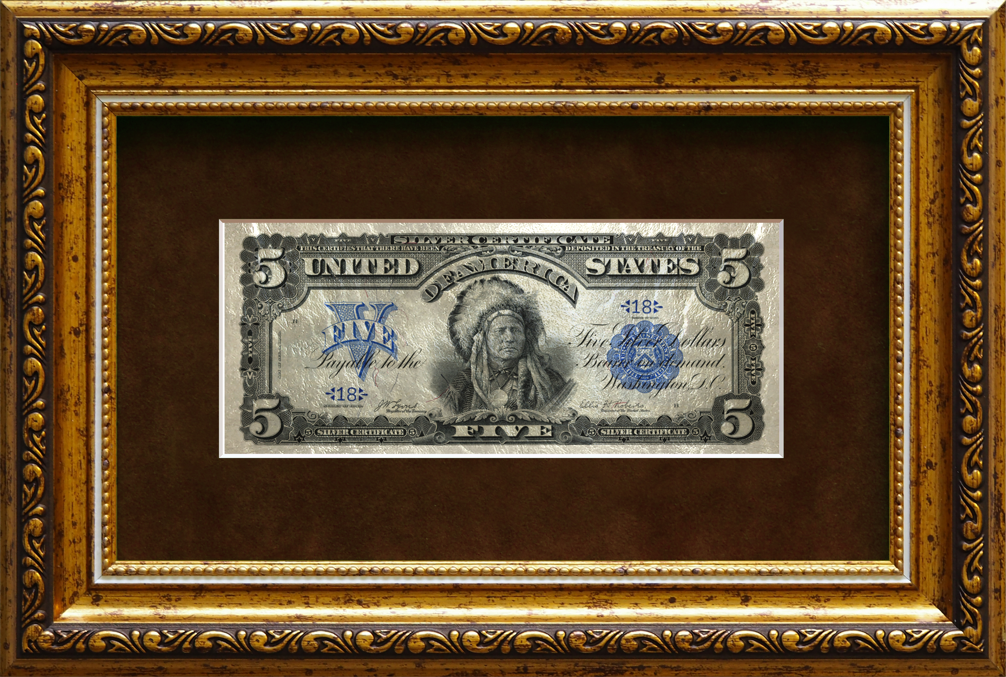 Картина на белом сусальном золоте банкнота-сертификат «Пять долларов "Индеец"»