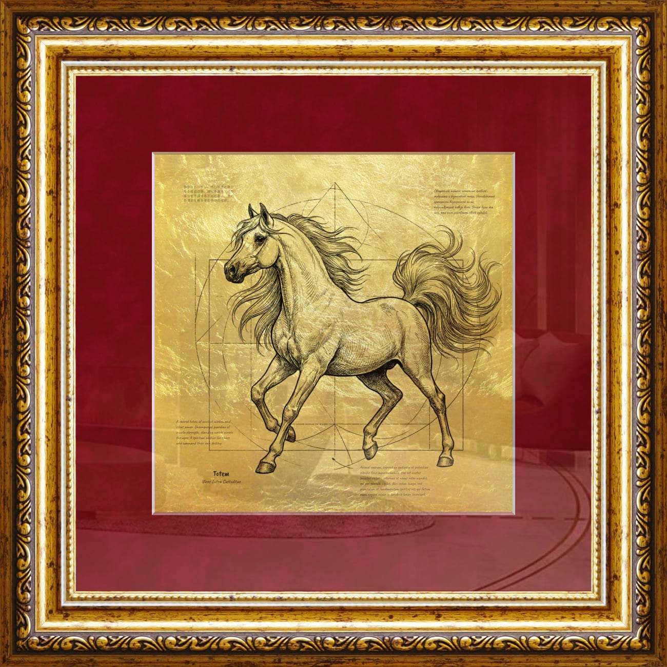 Перед вами эксклюзивная картина «Арабская лошадь - Тотем», выполненная вручную на полотне из настоящего сусального золота 23 карата.