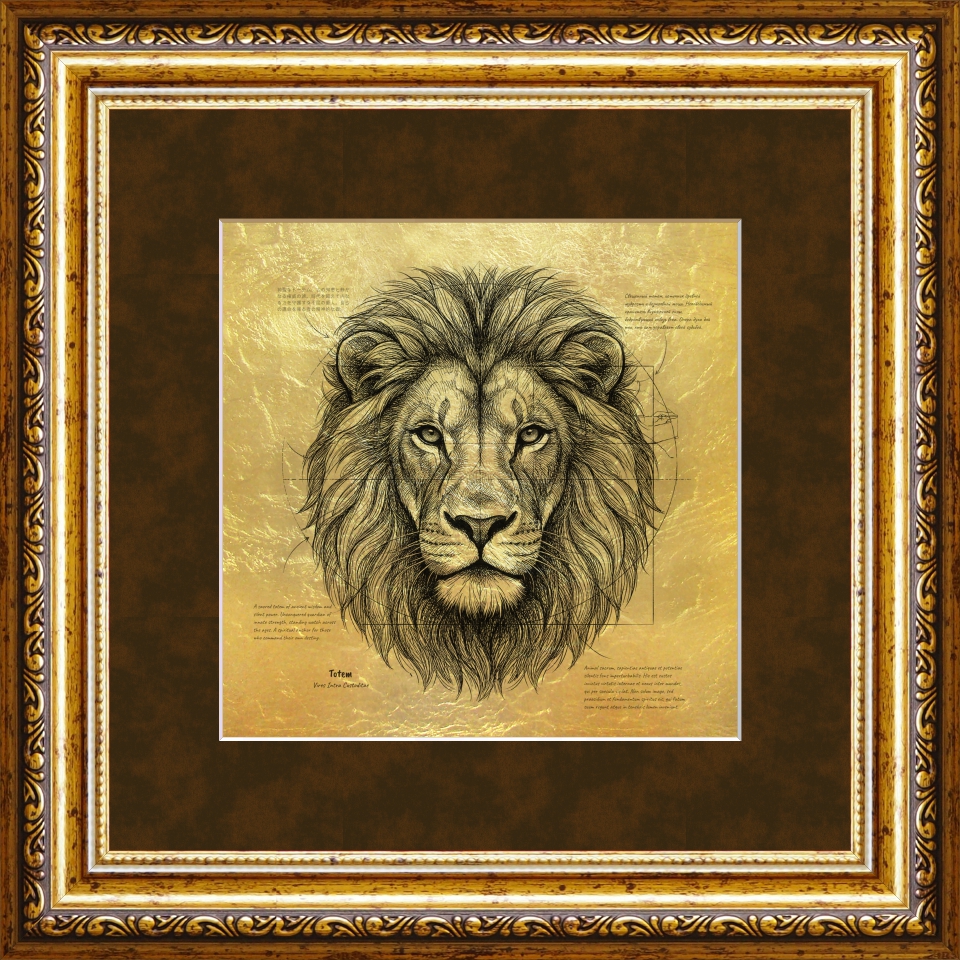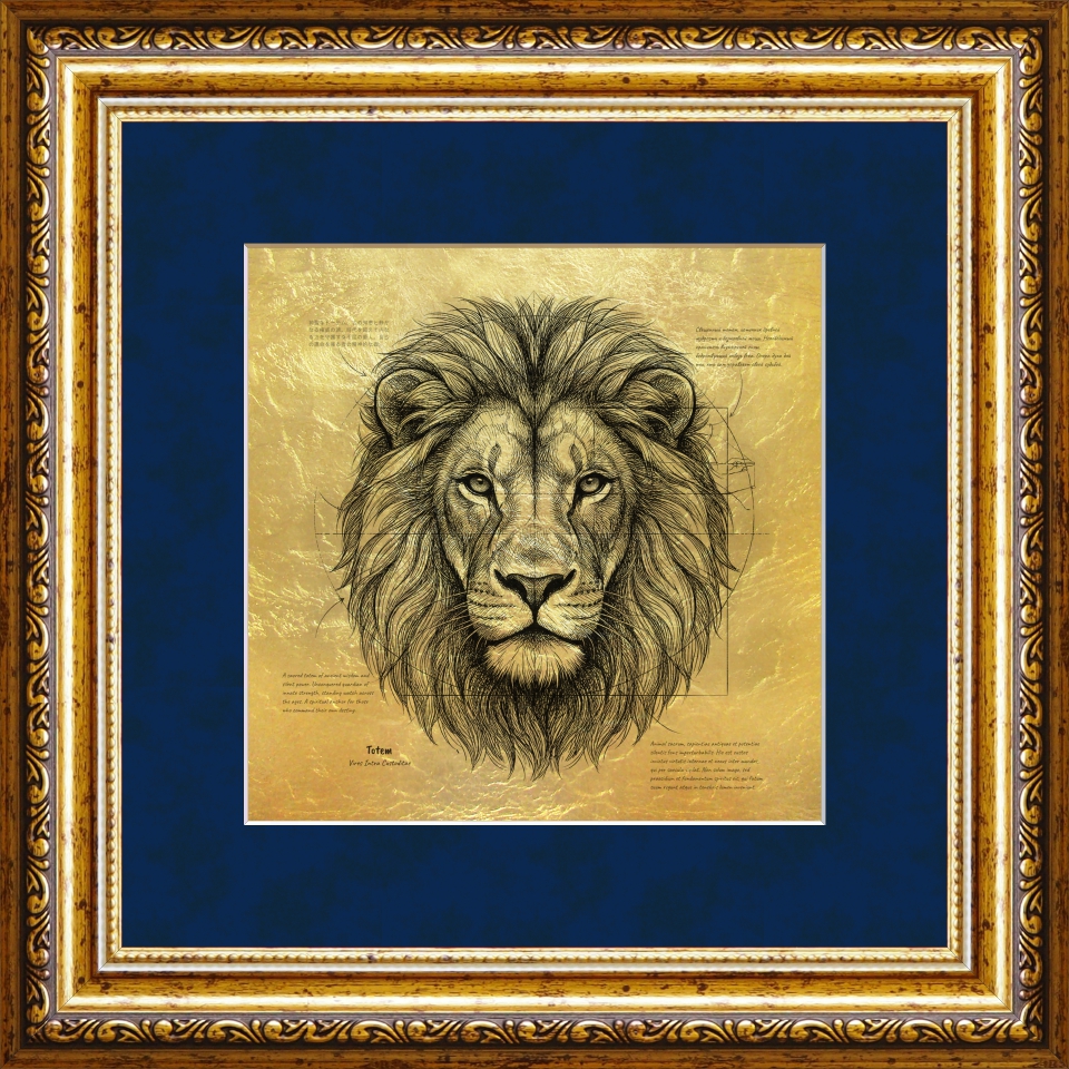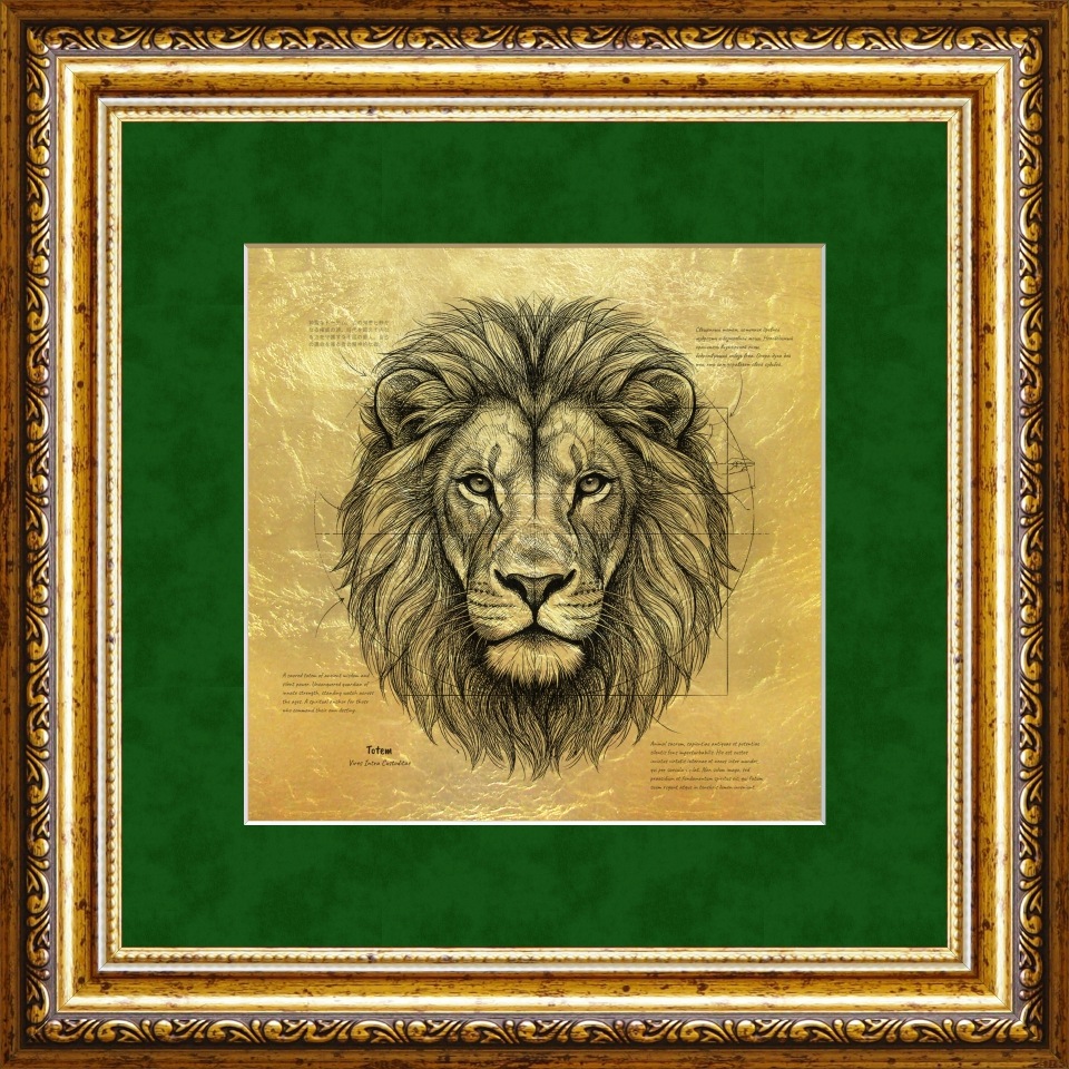 Перед вами монументальный портрет «Лев - Тотем», выполненный вручную на полотне из подлинного сусального золота 23 карата от Златовест.