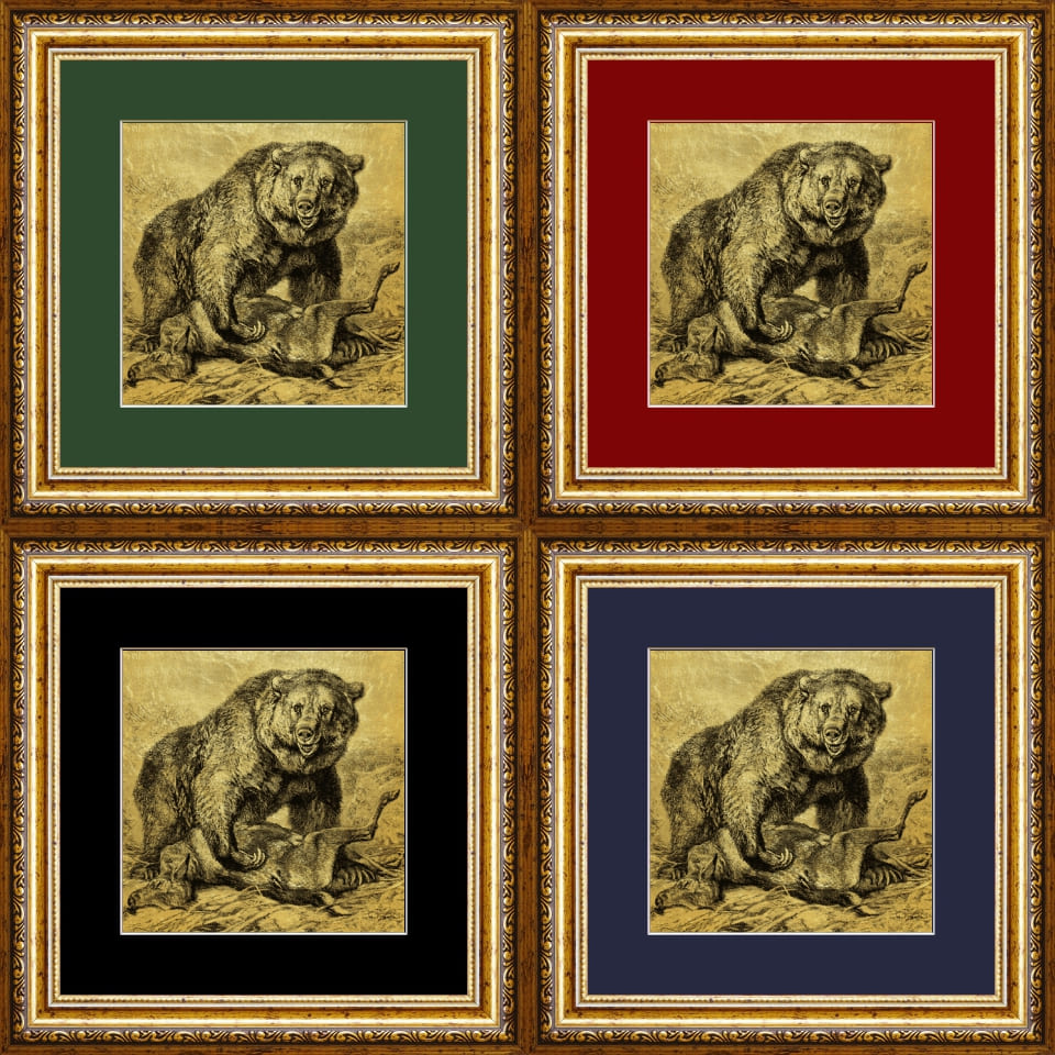 Ювелирная точность графики позволяет рассмотреть мельчайшие детали: мощный оскал хищника, рельеф густой шерсти и дикий пейзаж, которые эффектно контрастируют с глубоким коричневым бархатным паспарту и классическим золоченым багетом.