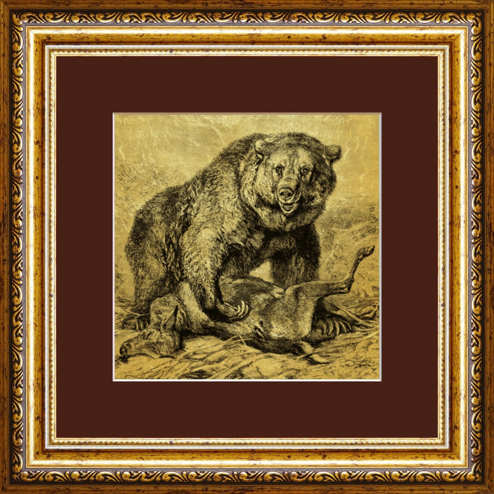 Перед вами классическая картина «Медведь», выполненная вручную на полотне из настоящего сусального золота 23 карата. Сюжет, вдохновленный старинными охотничьими гравюрами, запечатлел величественного таёжного хозяина в момент триумфа с добычей.