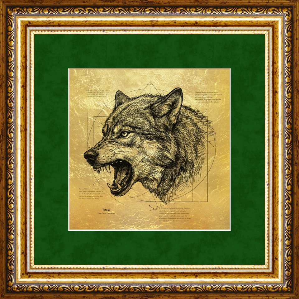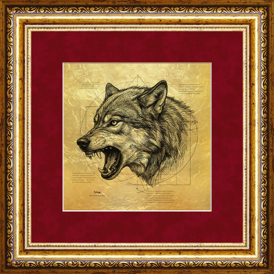 На полотне из подлинного сусального золота мастерски передана дикая энергия вожака: от влажного рельефа клыков до тончайшей графики вздыбленной на загривке шерсти.