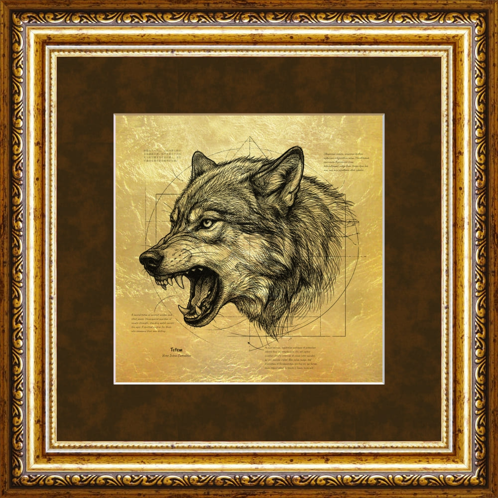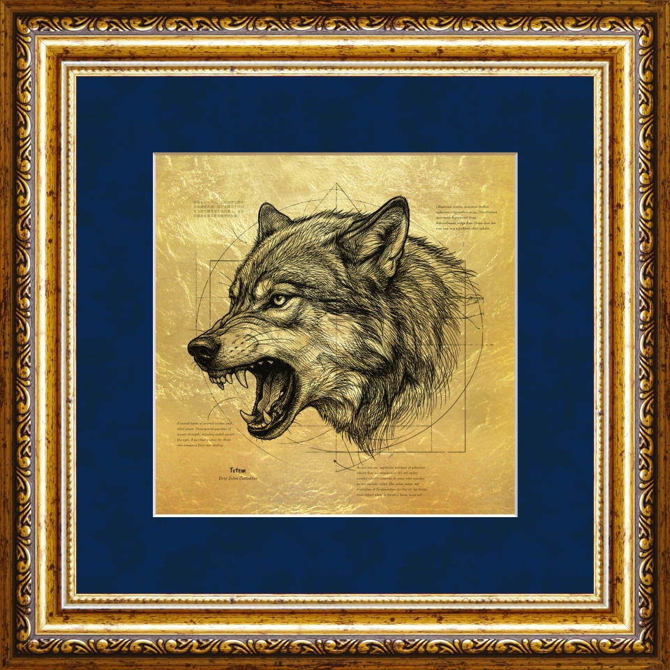 Математическая строгость чертежных линий на заднем плане создает уникальный визуальный контраст между первобытной силой зверя и выверенным порядком геометрических пропорций. Коричневое бархатное паспарту и классический золоченый багет превращают эту авторскую работу 960 пробы в доминирующий интерьерный акцент.