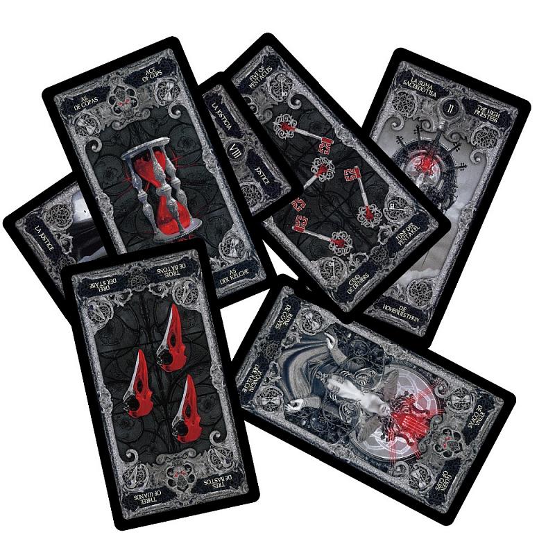 Fournier Nekro Tarot - гадальные карты Таро, дизайн которых разработан по мотивам книги Фурнье и представляет собой органичное сочетание лучших готических мотивов и идей. Иллюстрации выполнены невероятно талантливым молодым художником из Испании по фамилии Некро. Драматическая черно-белая эстетика выгодно дополняется и подчеркивается внезапными цветными всплесками. Изображения выполнены в стиле барокко.