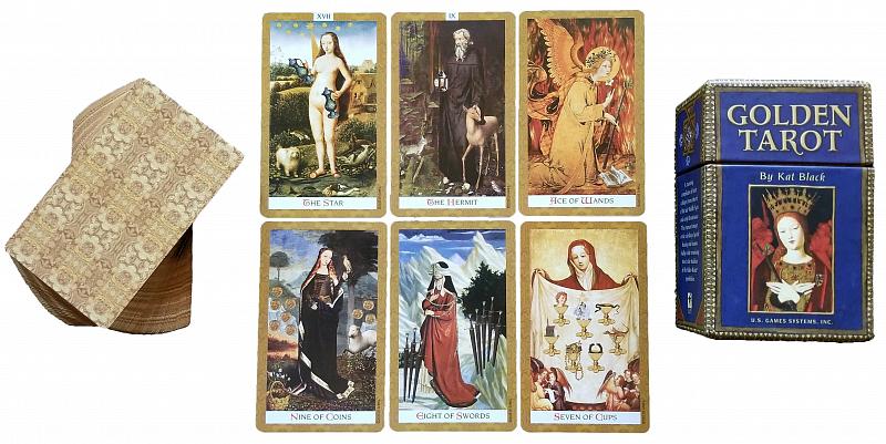 Колода карт «Golden Tarot by Kat Black» представляет собой отличный вариант для тех, кто устал от привычных Таро и хочет увидеть что-то новое и удивительное. Создателем является художница Kat Black родом из Австралии, которая руководствовалась в изображениях ранним Ренессансом, что ощущается в каждом элементе. Помимо традиционных мистических символов, она добавила в иллюстрации элементы, упрощающие интерпретацию. Благодаря такому подходу, даже новички могут быстро разобраться. Красоту подчёркивает изысканная золотая рамка, которая окаймляет каждое произведение искусства.