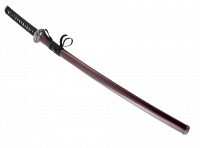 Катана с бордовыми ножнами. На касире изображен воин. Цуба украшена японскими мотивами. Цука оклеена материалом, имитирующим кожу ската и обмотана цука-ито из хлопка. Лезвие изготовлено из нержавеющей стали марки 420С (25 HRC) с высокотехнологичной обработкой (полировкой) и не заточено. Деревянные лакированные ножны (сая) бордового цвета и сагео черного цвета. Коигути и кодзири сделаны из металла