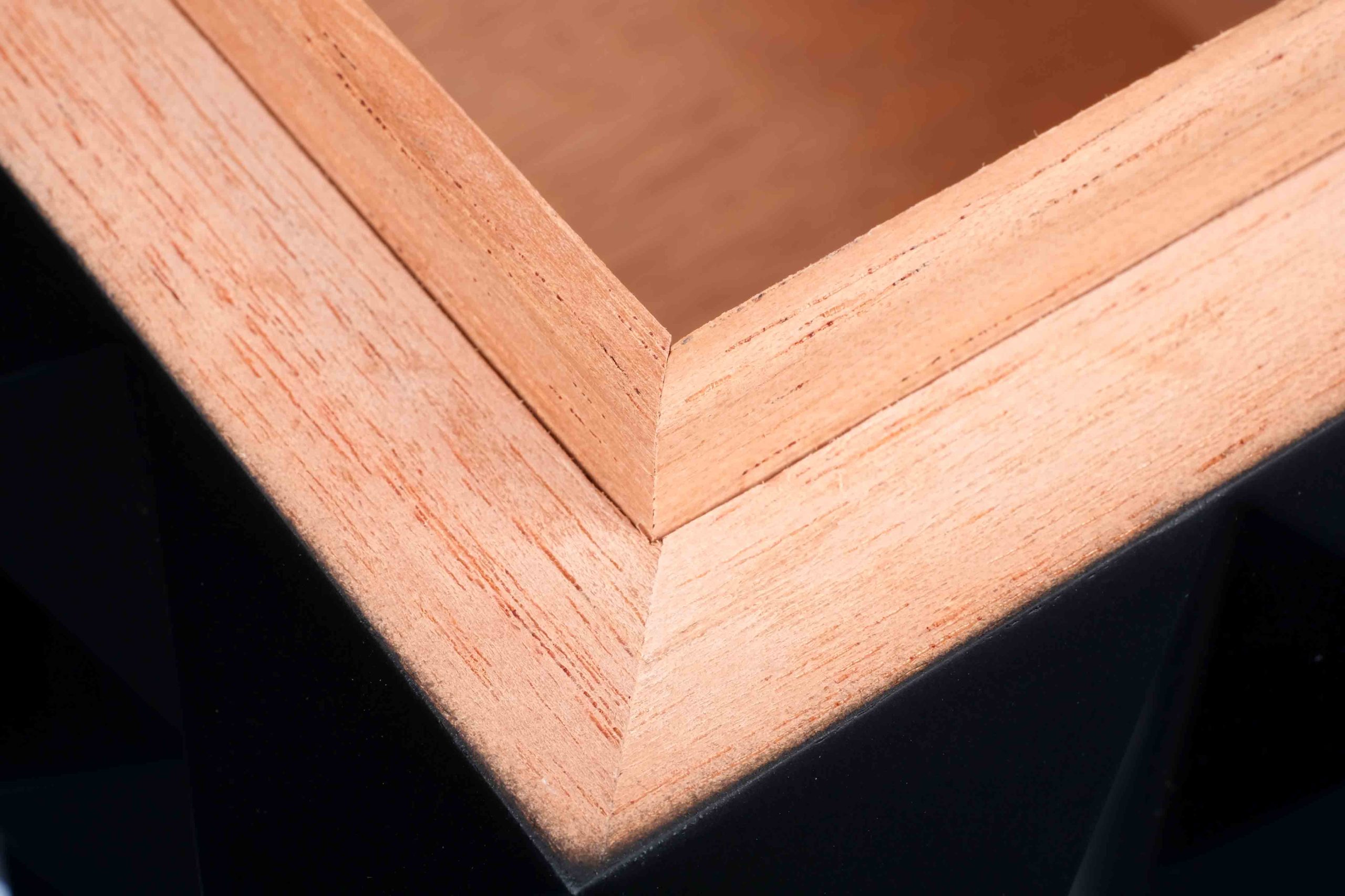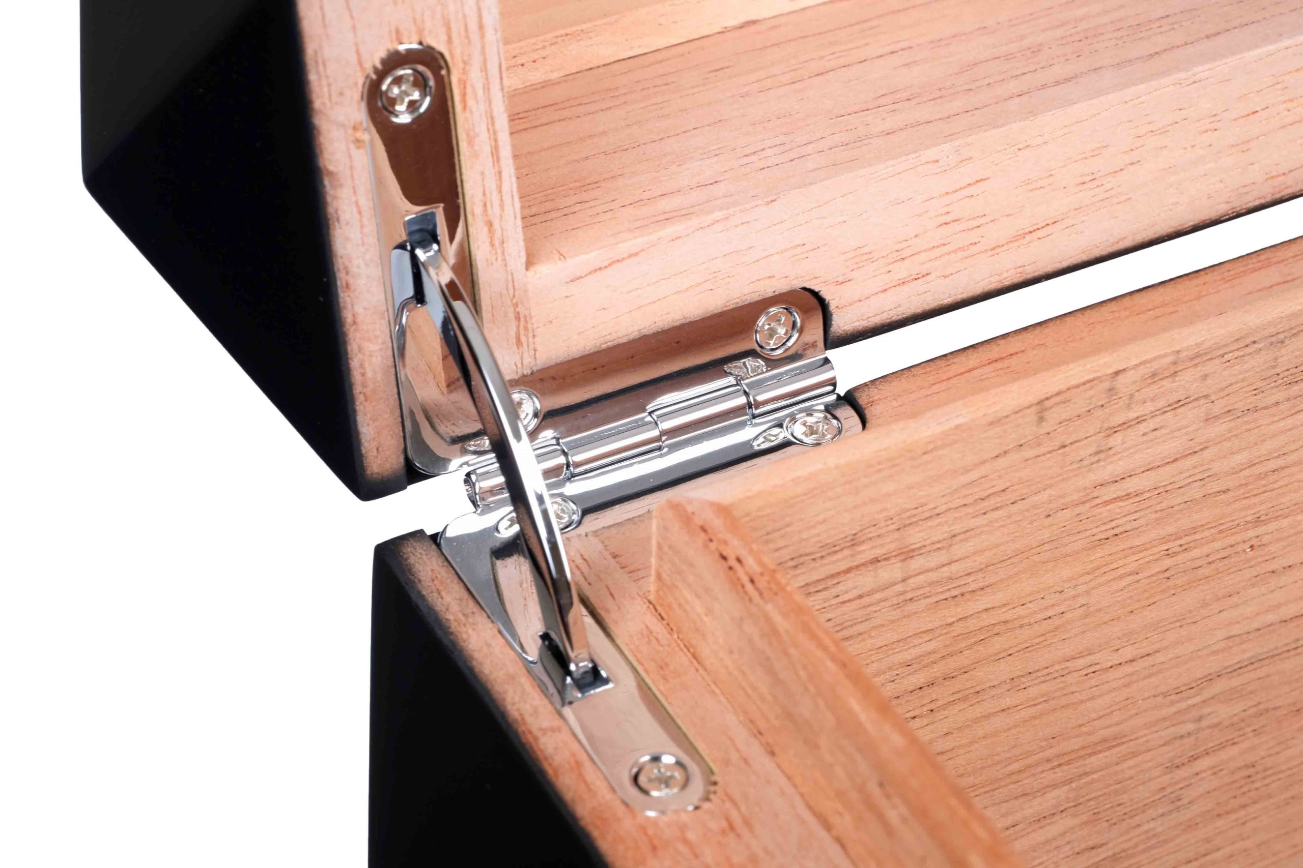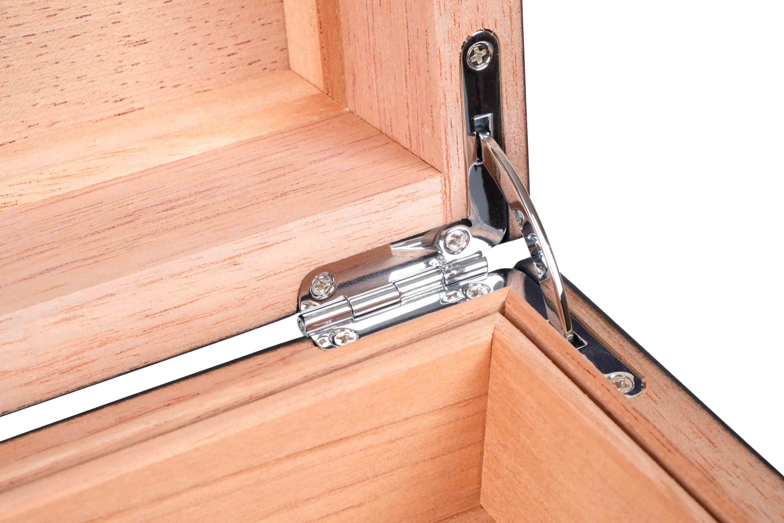 В комплекте с хьюмидором идут высокоточный электронный термогигрометр и увлажнитель, крепящиеся в любом месте на крышке благодаря скрытой под кедровым шпоном магнитной пластине.