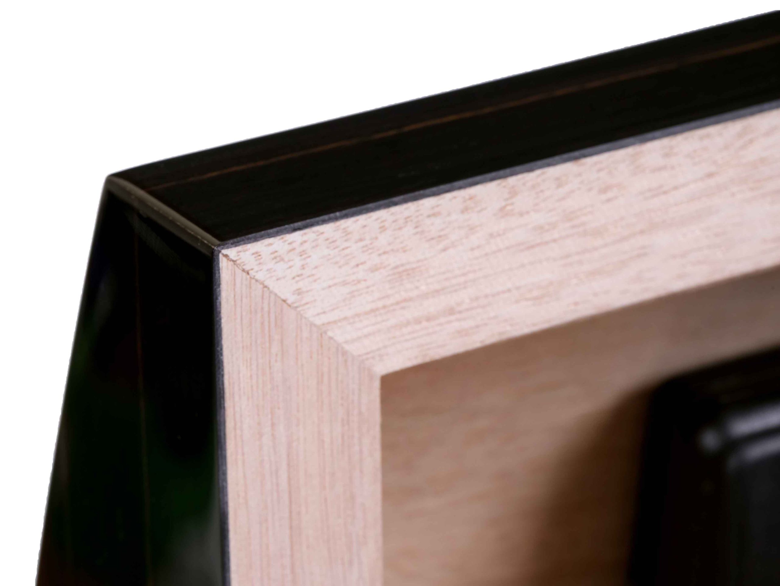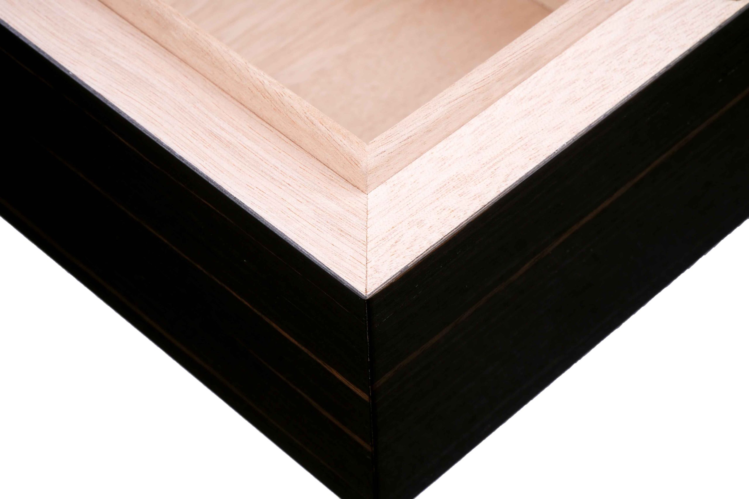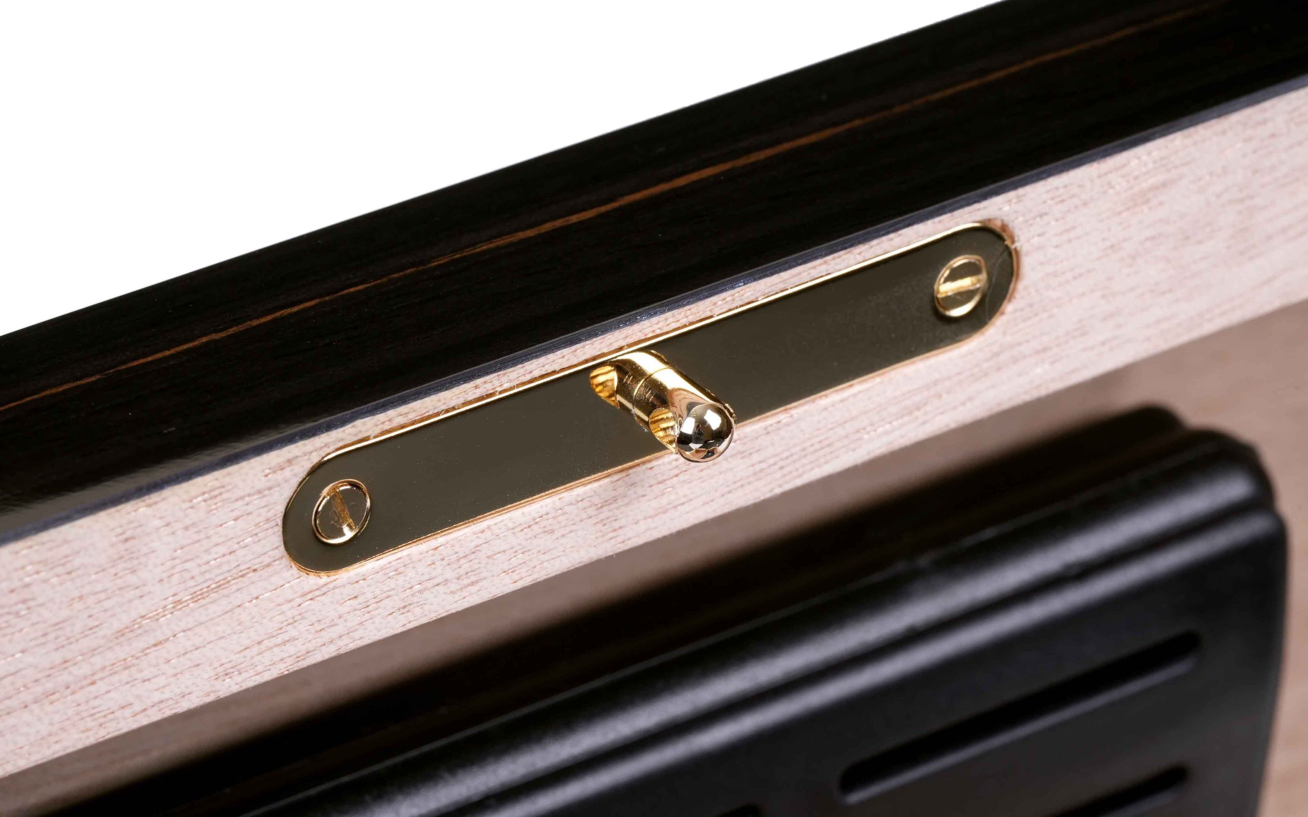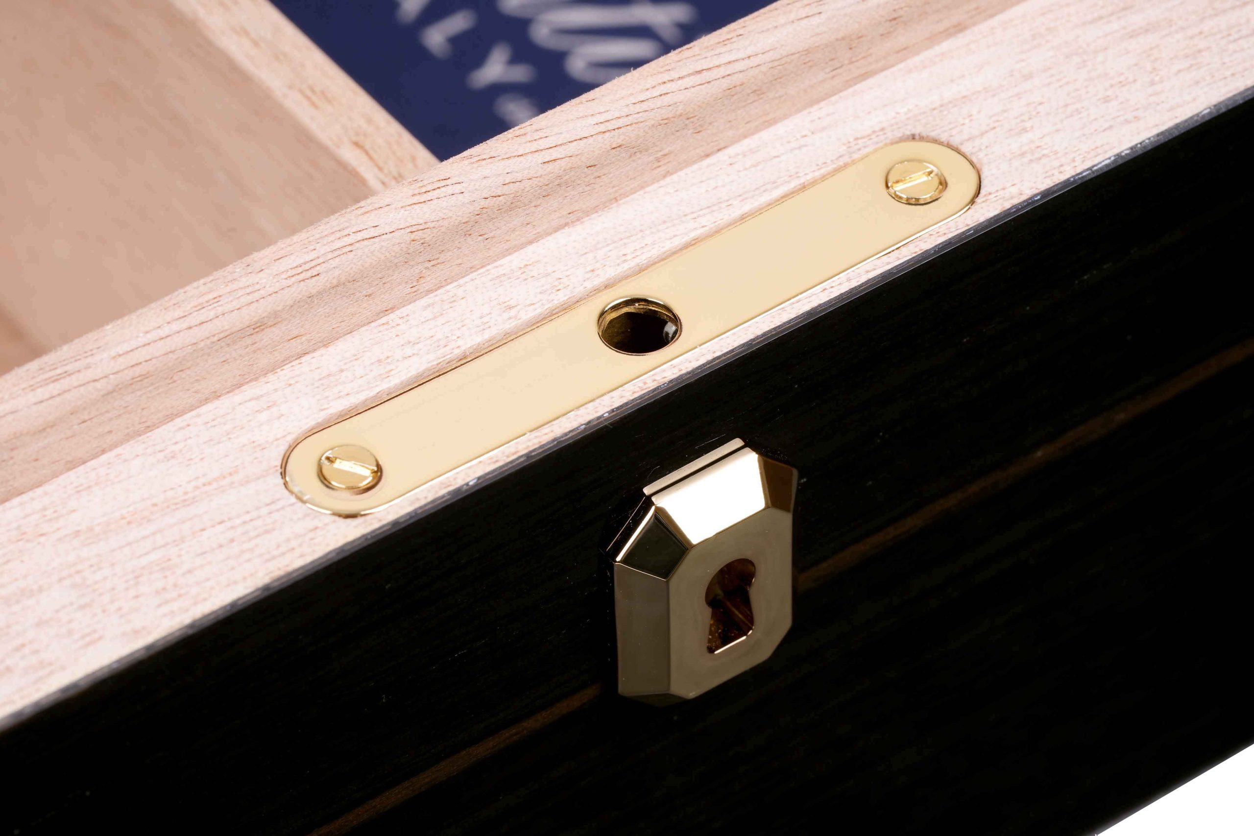 Внутренняя отделка выполнена из высококачественного испанского кедра — традиционного материала, способного мягко увлажнять воздух и придавать сигарам лёгкий ароматический оттенок. Кедр сохраняет свежесть табака, способствует равномерному «дыханию» сигар и защищает их от высыхания. Внешняя поверхность хьюмидора покрыта тонированным шпоном Эбенового дерева из Индонезии, изысканная текстура которого подчёркнута семислойным глянцевым лаком. Каждый слой лакировки наносится вручную, придаёт древесине глубину и бархатистый блеск, подчёркивая естественную красоту древесного рисунка.