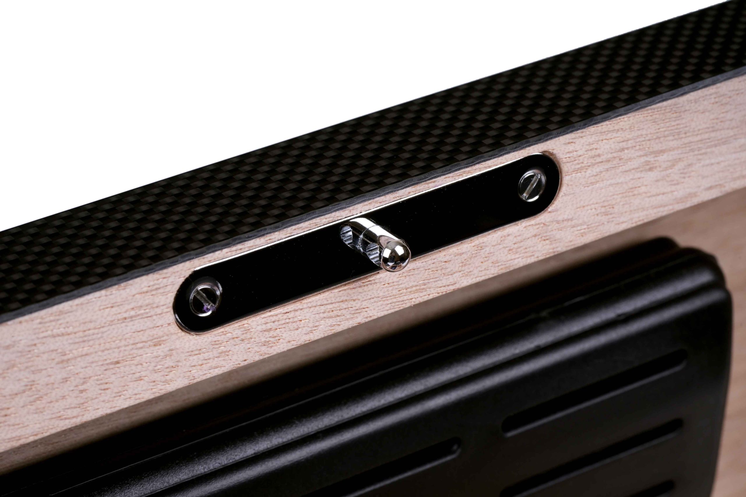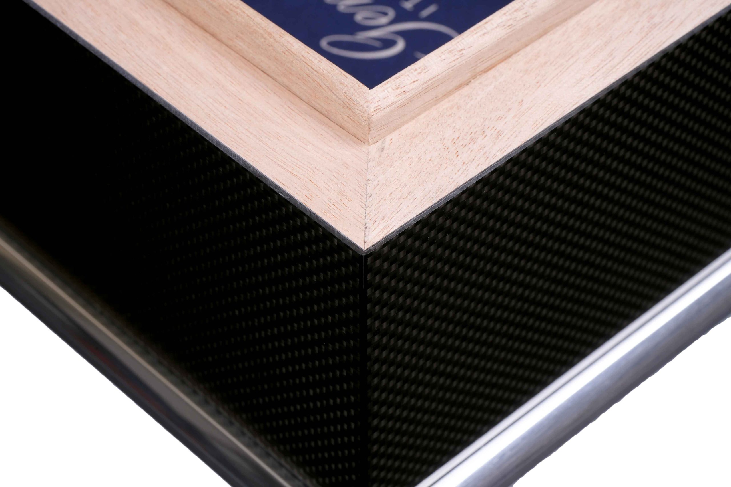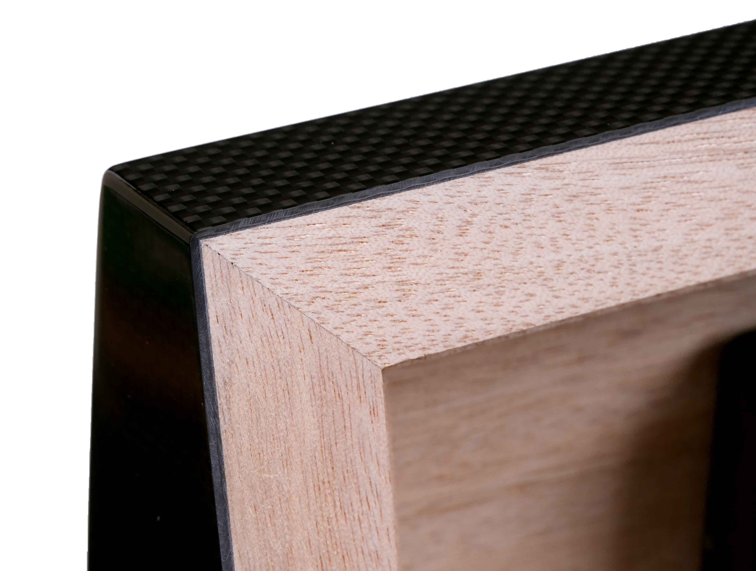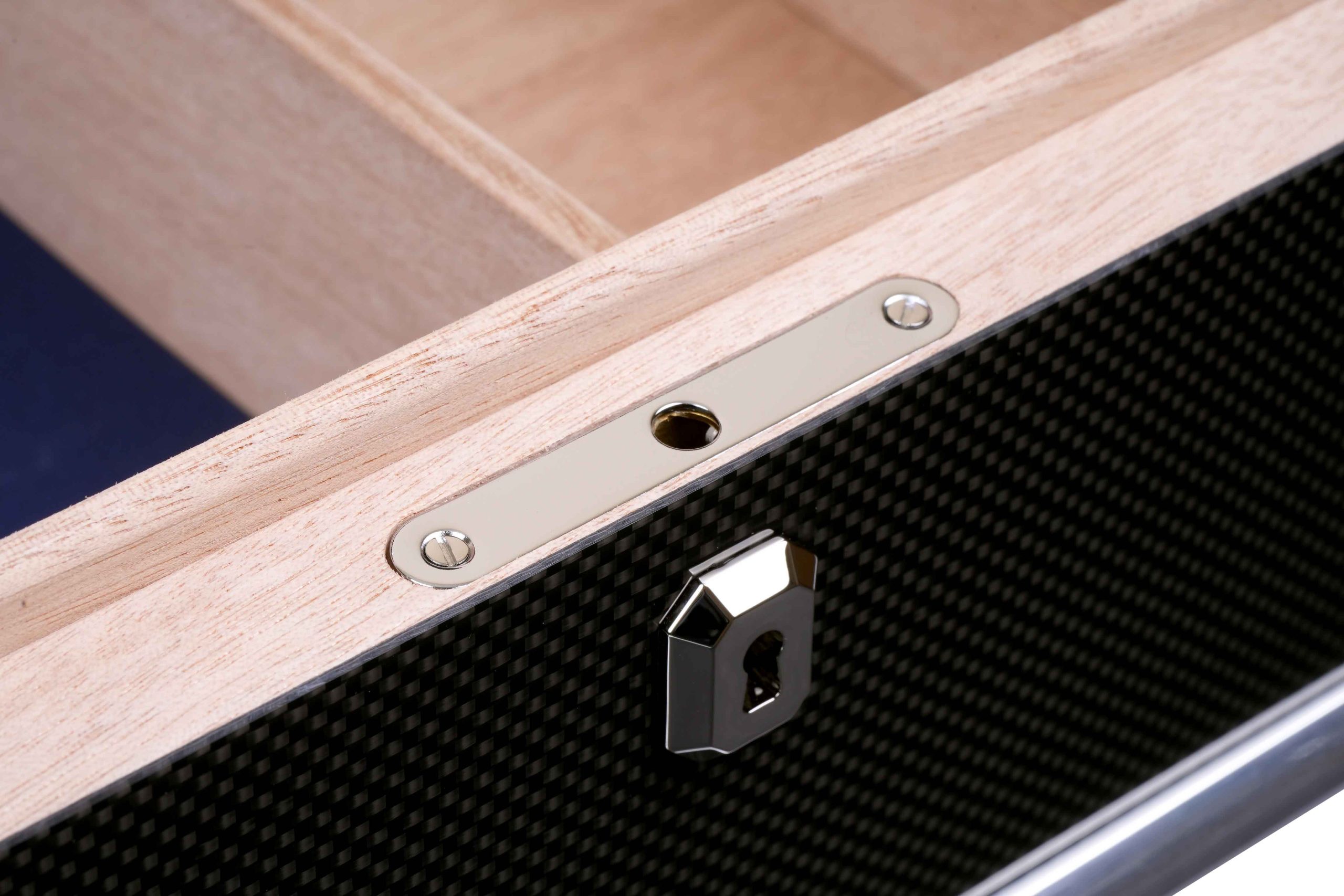 Внутренняя отделка выполнена из высококачественного испанского кедра — традиционного материала, способного мягко увлажнять воздух и придавать сигарам лёгкий ароматический оттенок. Кедр сохраняет свежесть табака, способствует равномерному «дыханию» сигар и защищает их от высыхания. Внешняя поверхность хьюмидора покрыта Карбоном (углеродным волокном), текстура которого подчёркнута семислойным глянцевым лаком.