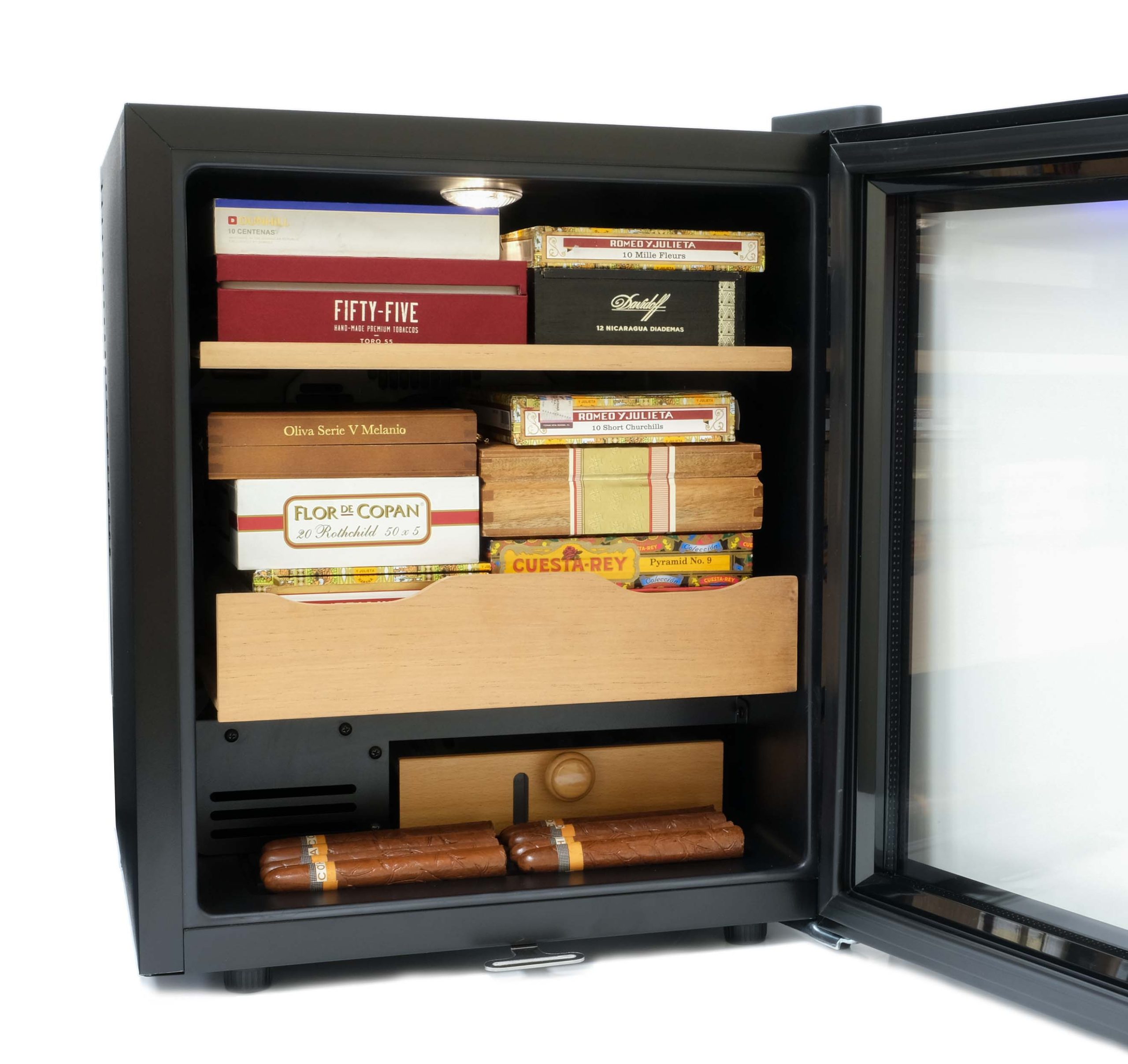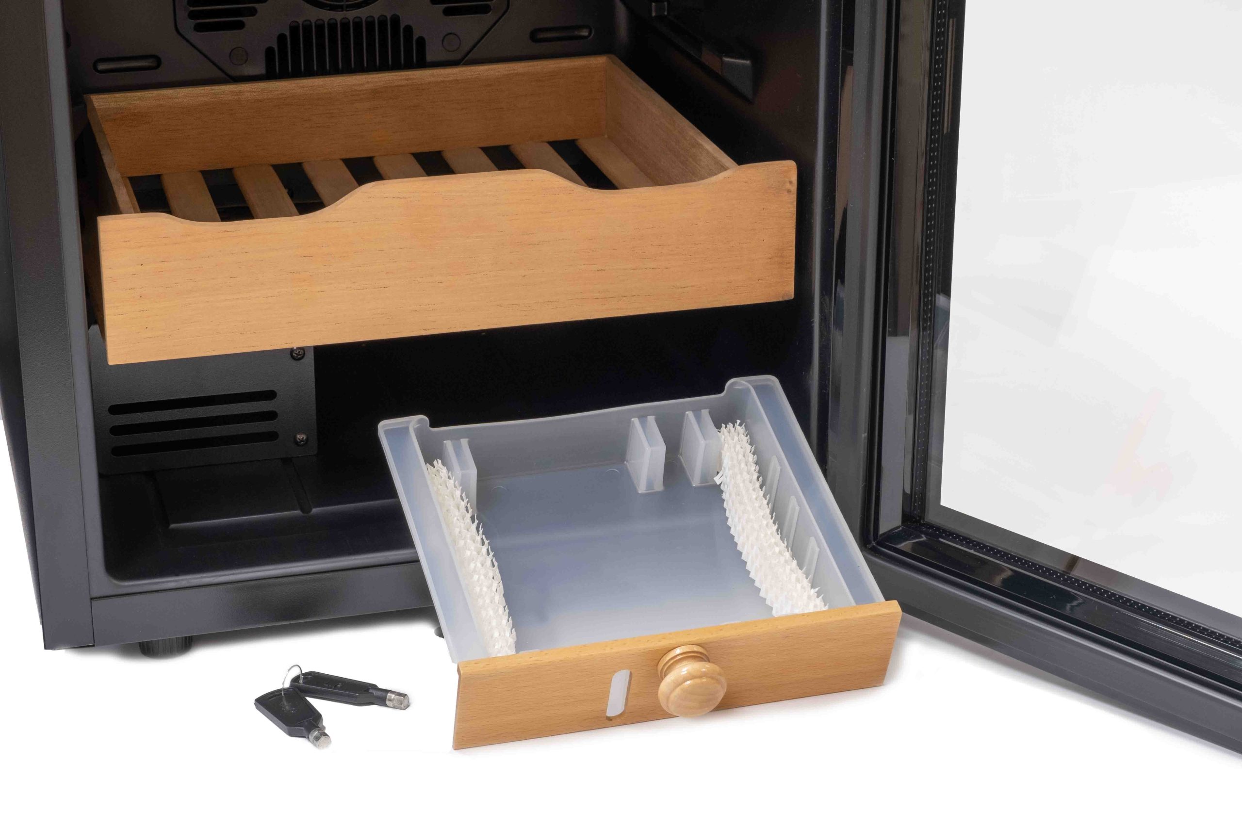 Позволяет хранить до 400 сигар в комфортных условиях и сводит процесс ухода к минимуму (объема встроенного лотка для воды хватает примерно на 2-4 недели эксплуатации).