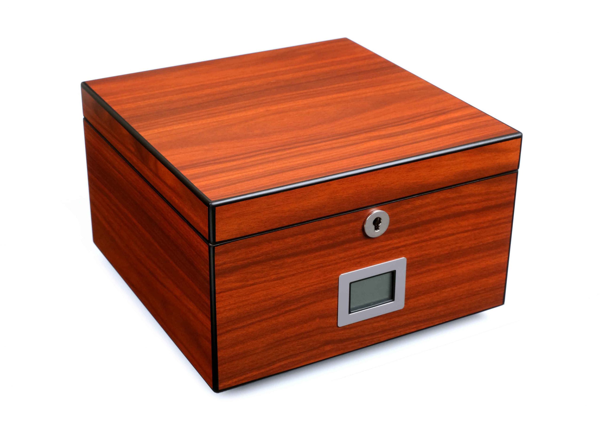 Внутренняя отделка выполнена из испанского кедра, в комплекте электронный термогигрометр и увлажнитель с акриловым полимером нового поколения, лоток и съемная перегородка для сигар, замок с ключом, инструкция по уходу.