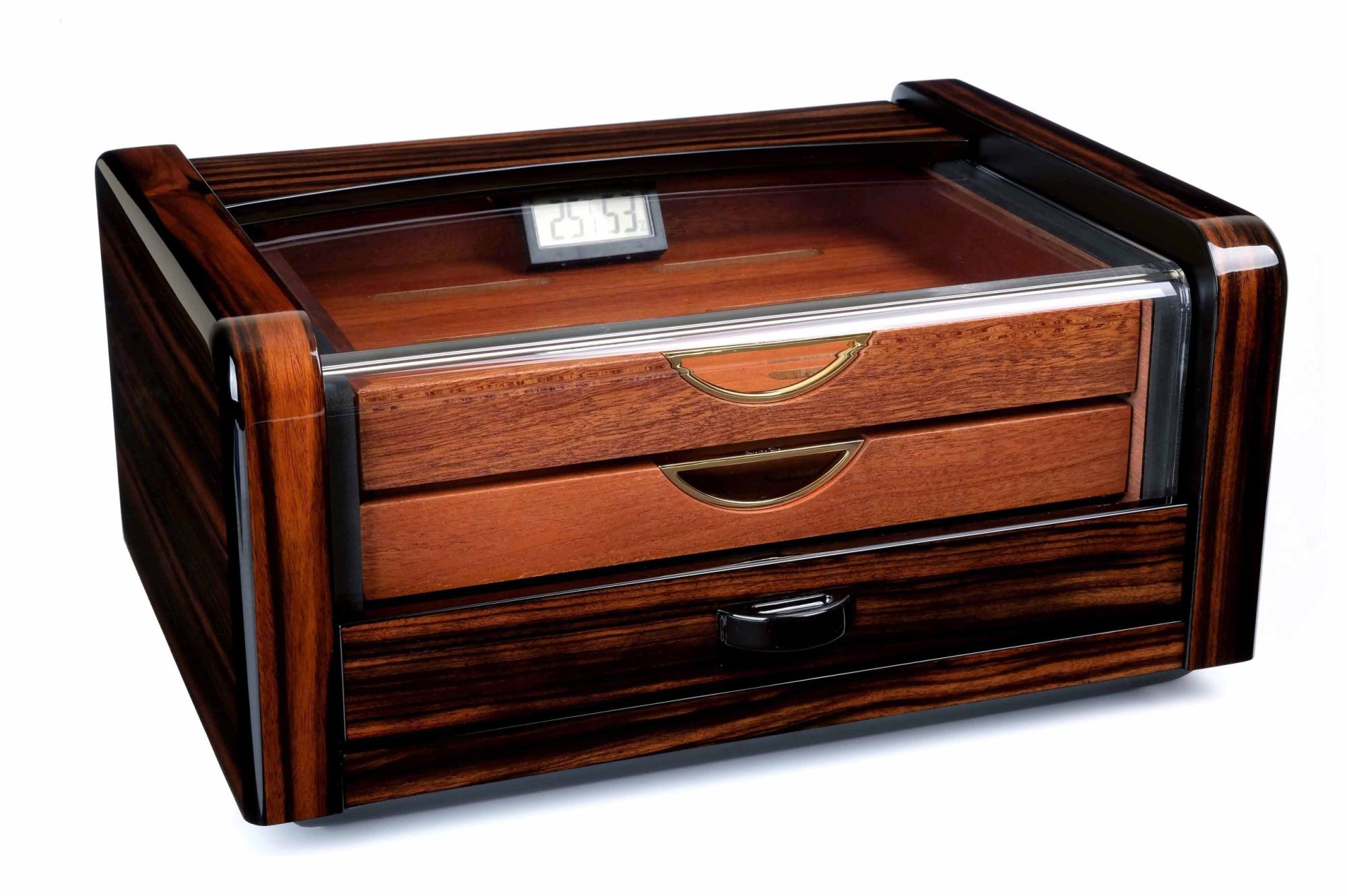 Корпус хьюмидора изготовлен из комбинации ценных пород дерева, что обеспечивает высокую устойчивость к деформации при перепадах температуры и влажности - ключевое преимущество для долгосрочной стабильности микроклимата.