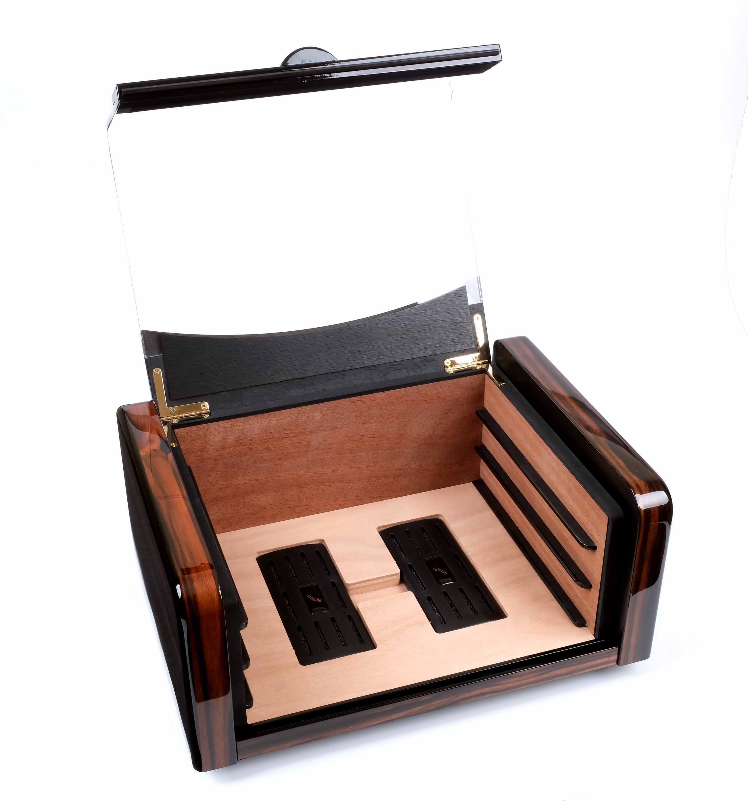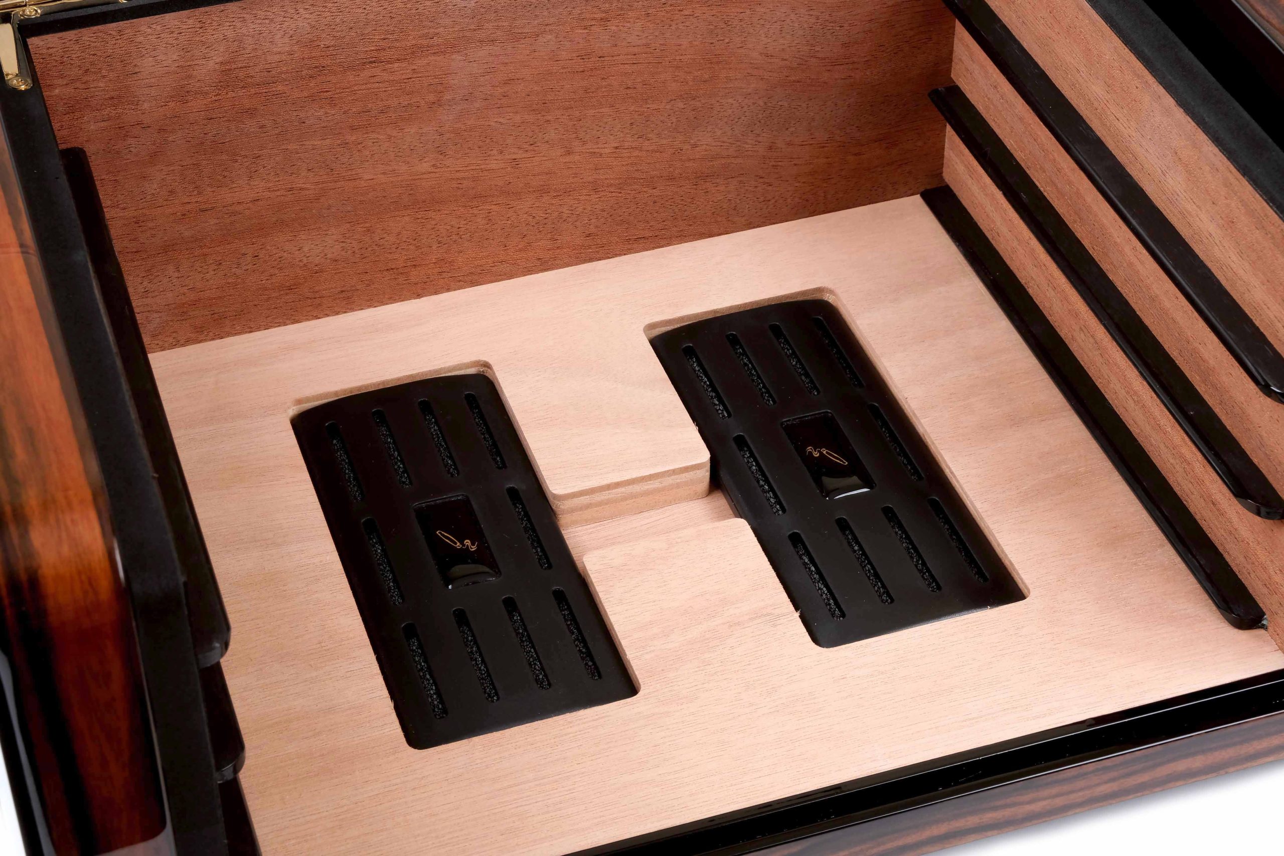 Два встроенных увлажнителя с акриловым полимером размещены на дне хьюмидора для равномерного распределения влаги по всему объёму.