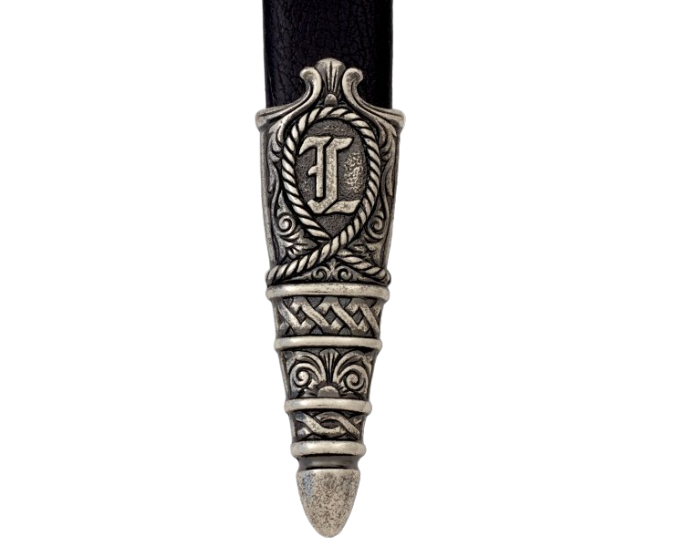 Ножны выполнены из пластика и обтянуты экокожей черного цвета. Украшены металлическими элементами на устье и наконечнике с вензельными инициалами владельца.
