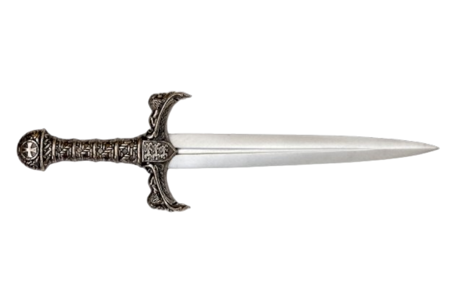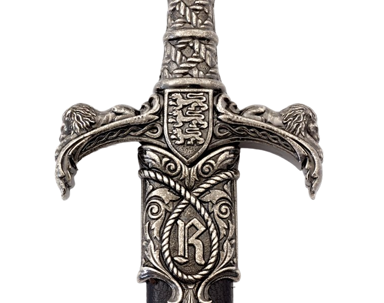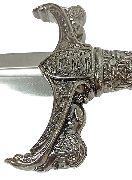 Макет кинжала выполнен из металлического сплава (цинковый сплав и никель). Навершие кинжала украшено лапчатым крестом, а в центре гарды изображен герб Англии (3 льва с языками).