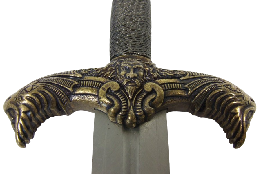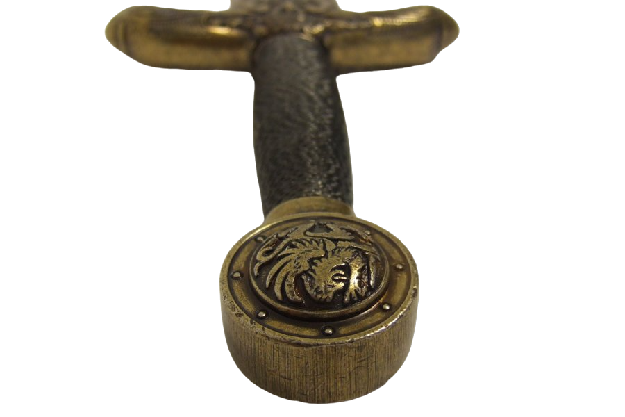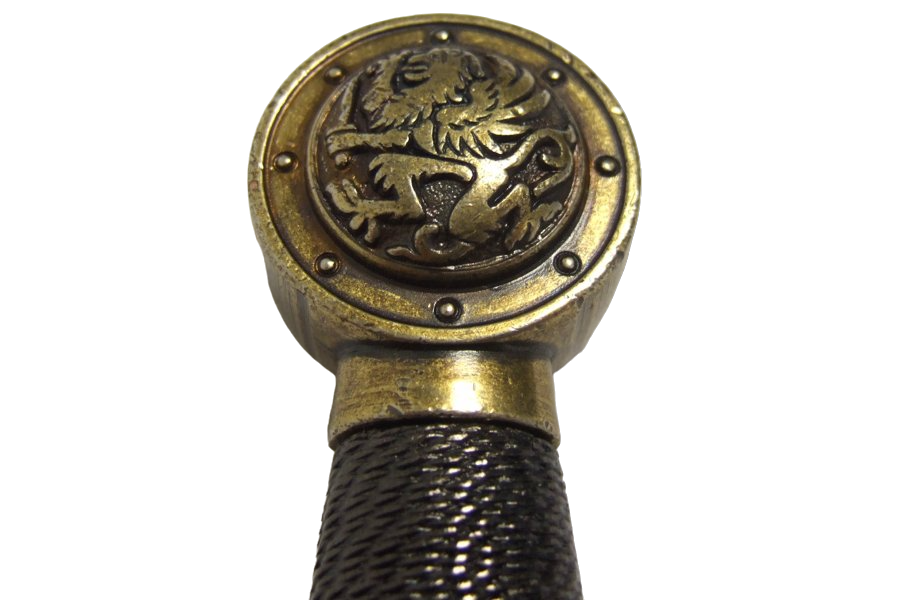 Макет кинжала выполненный из металла. В центре навершия изображен лев, стоящий на задних лапах. Черенок с имитацией проволочной обмотки.