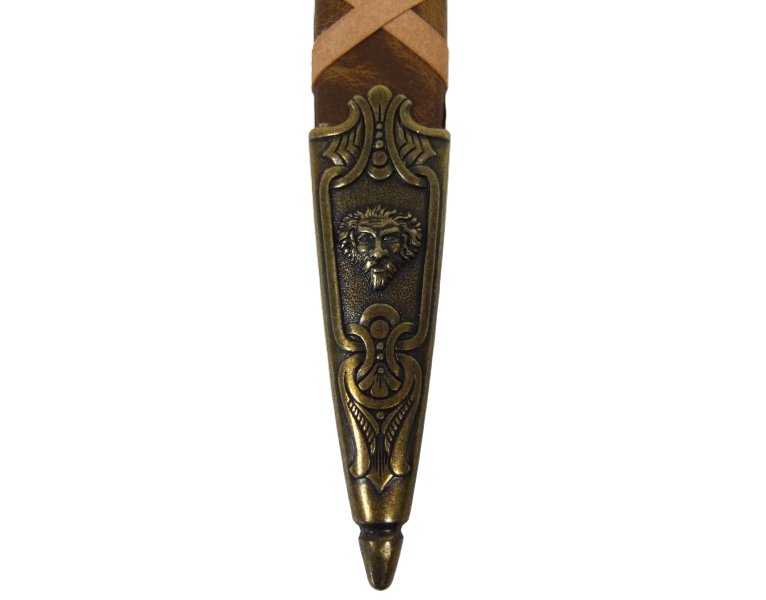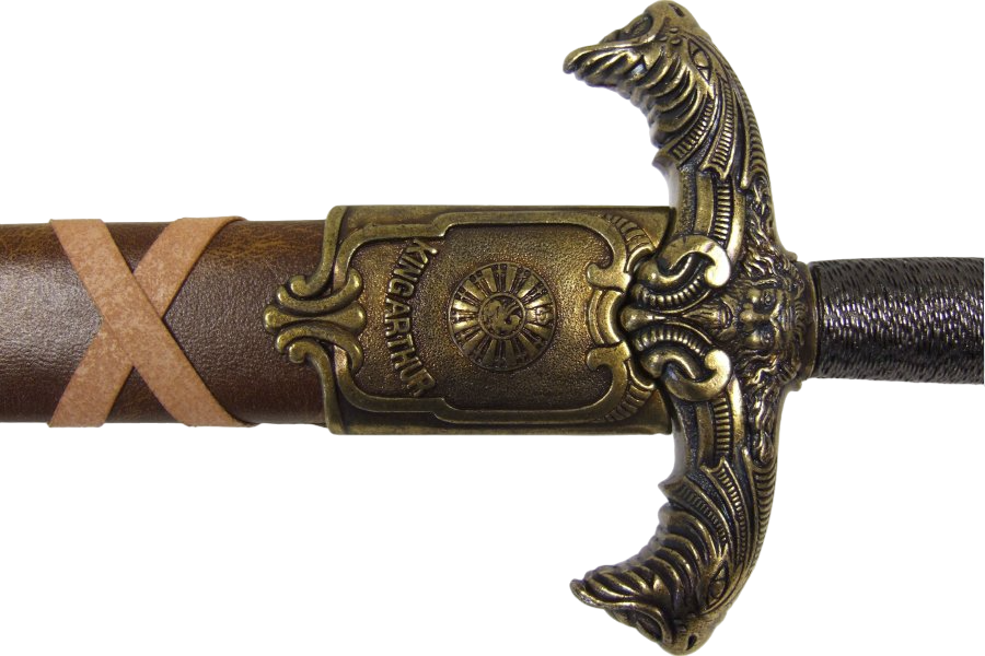 Ножны выполнены из пластика и обтянуты экокожей коричневого цвета. Украшены оплеткой из светло-коричневой экокожи и металлическими элементами на устье и наконечнике. На устье имеется надпись "King Arthur".