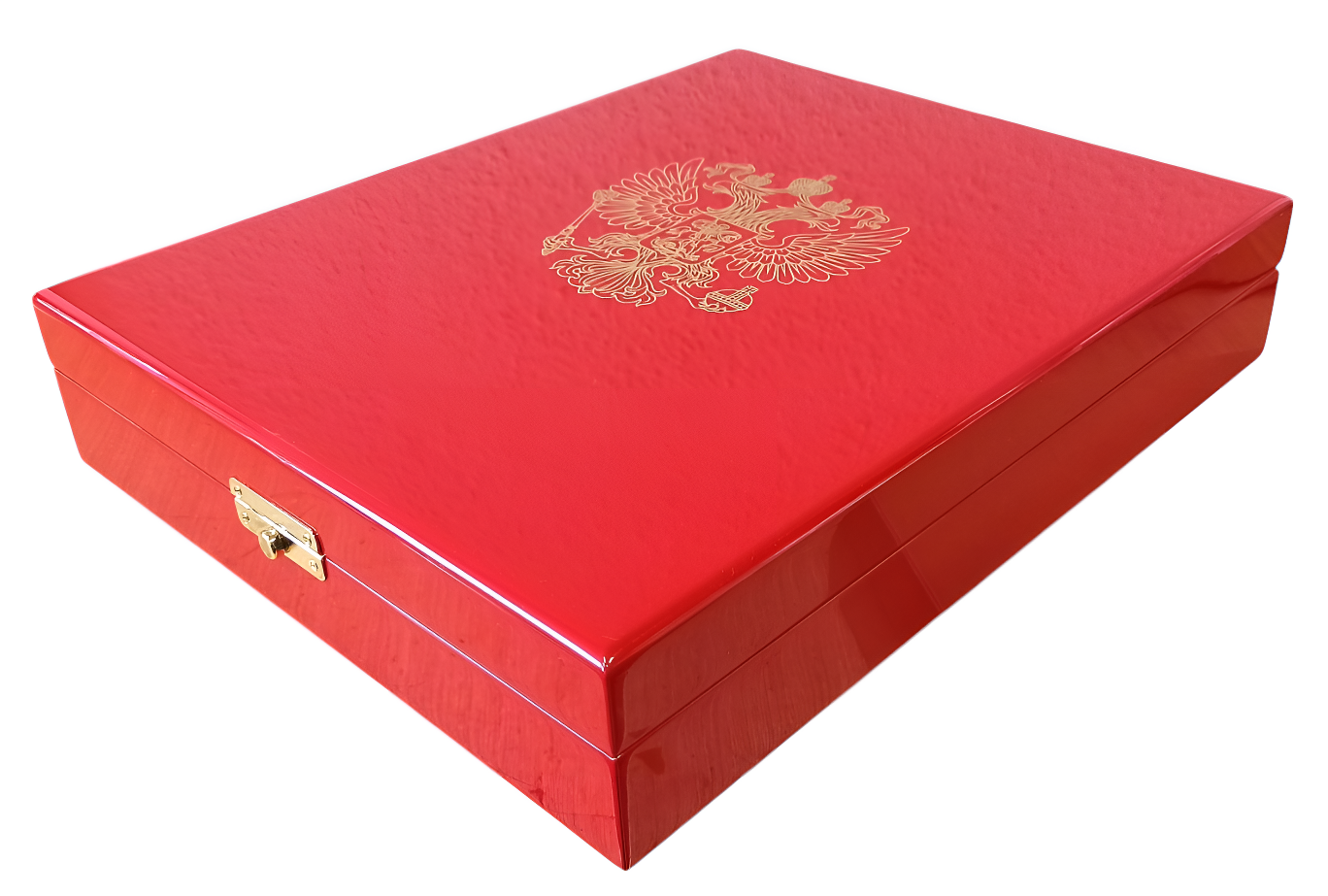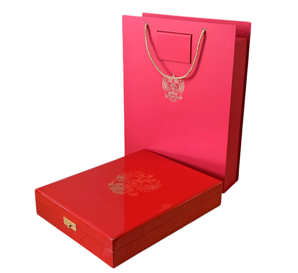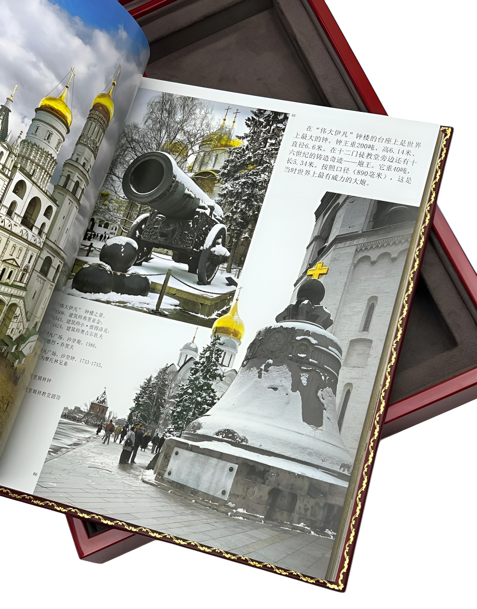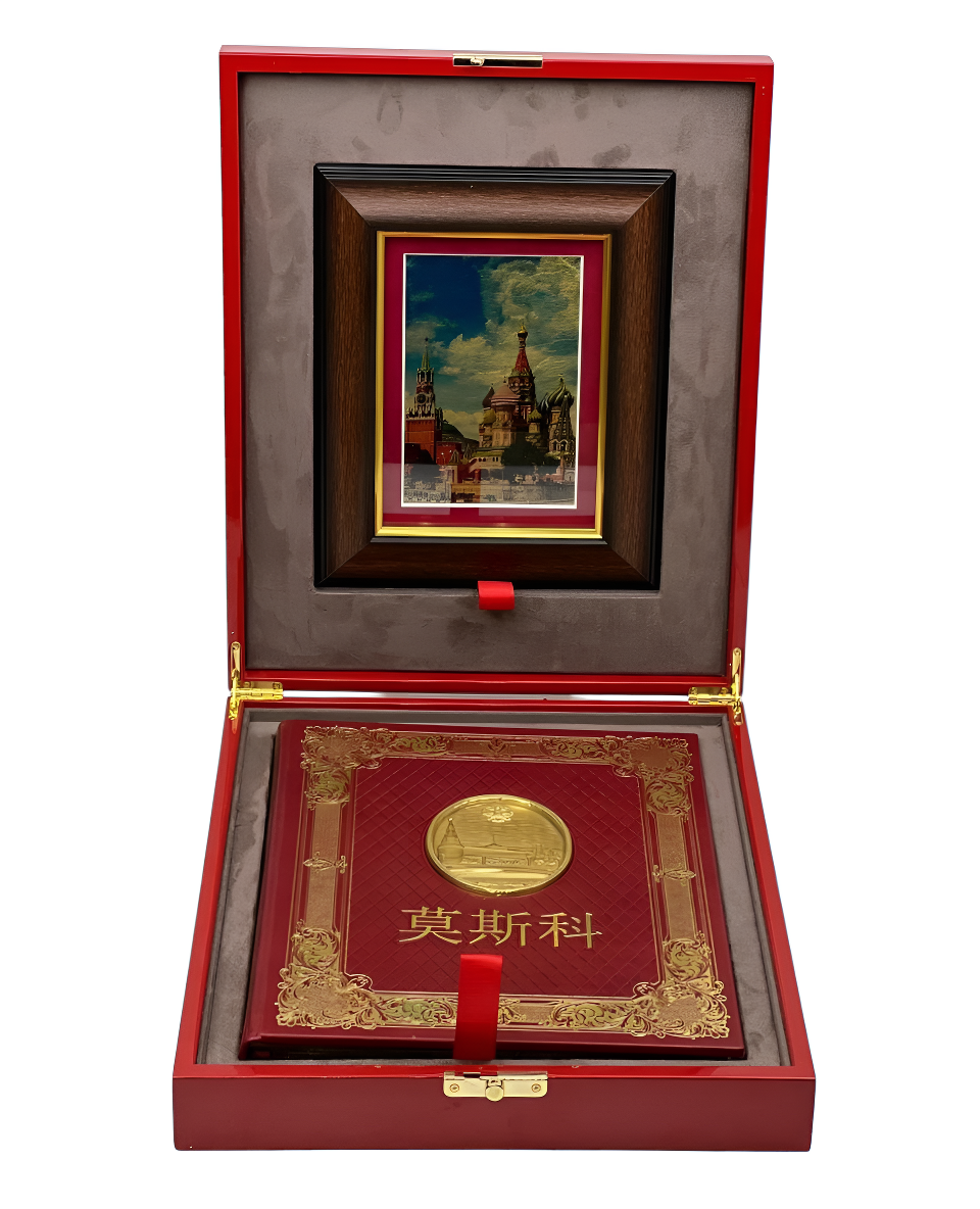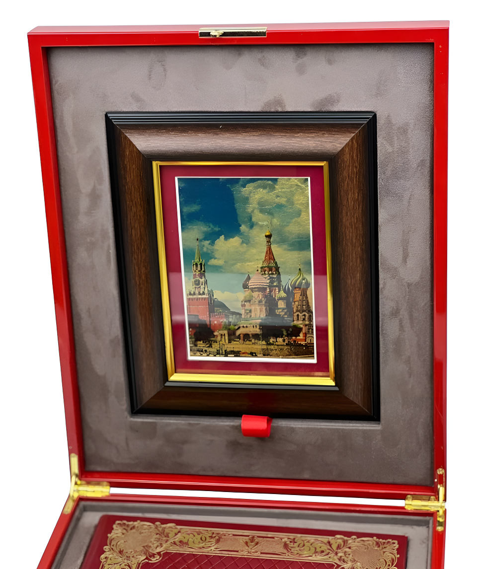 Оригинальный подарочный набор включает в себя книгу в кожаном переплете "Москва" и картиной, оформленных в деревянной лакированной шкатулке покрытой рояльным лаком и украшенной гербом из металлостикера золотого цвета.