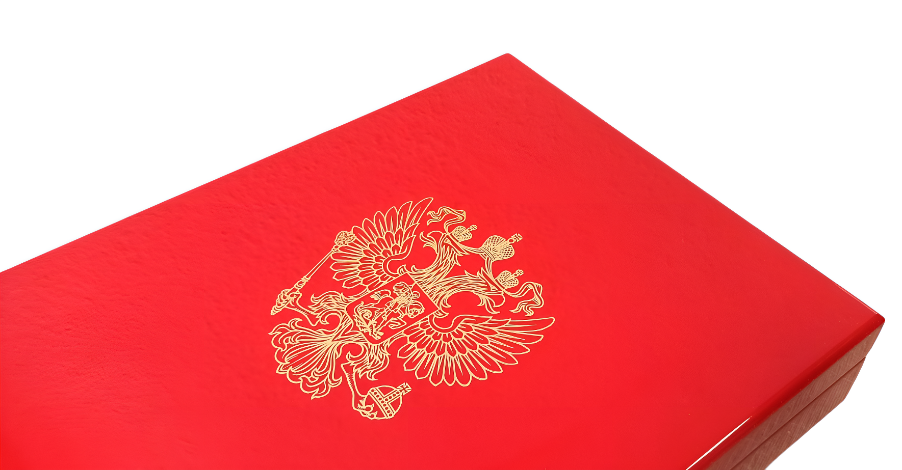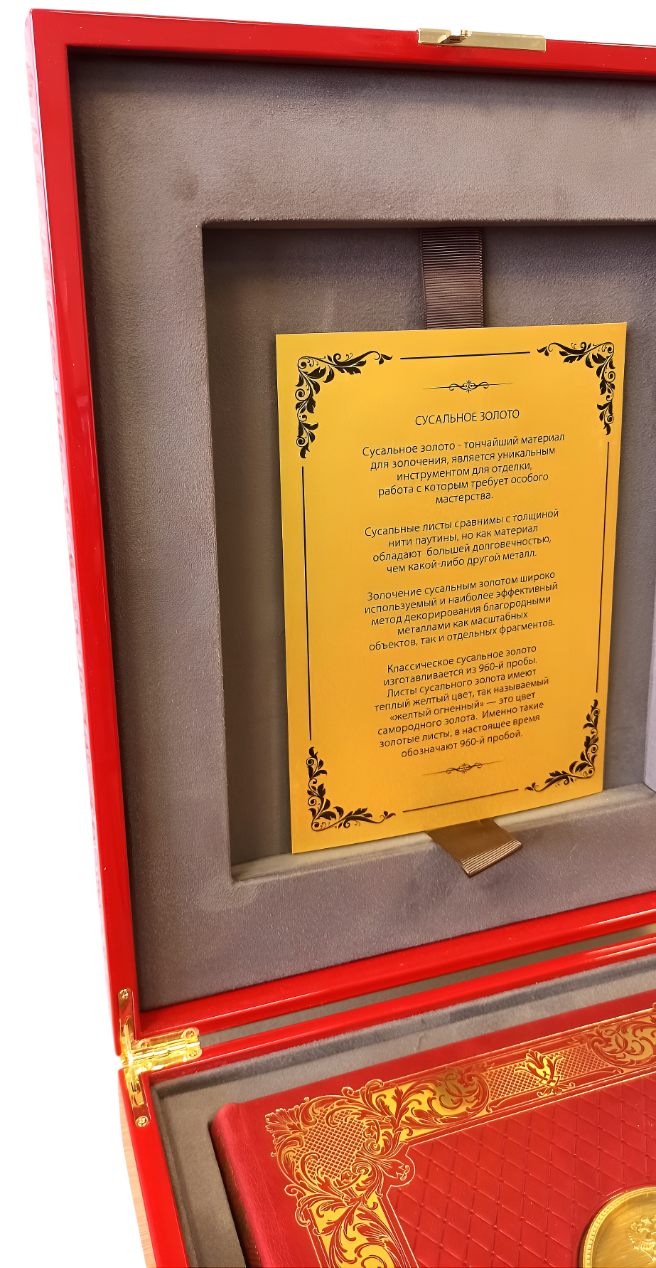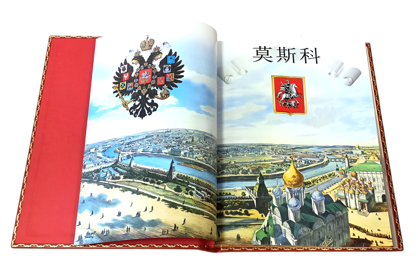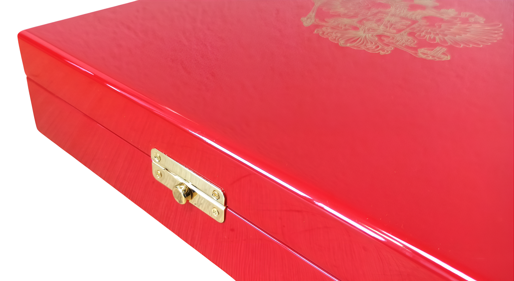 Оригинальный подарочный набор включает в себя книгу в кожаном переплете "Москва" и картиной, оформленных в деревянной лакированной шкатулке покрытой рояльным лаком и украшенной гербом из металлостикера золотого цвета.