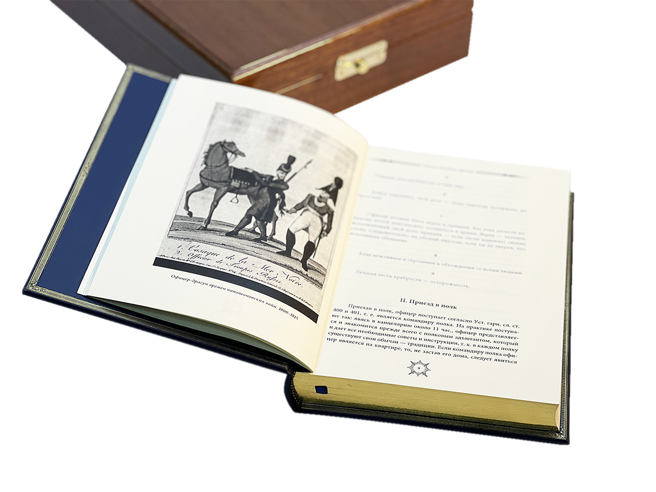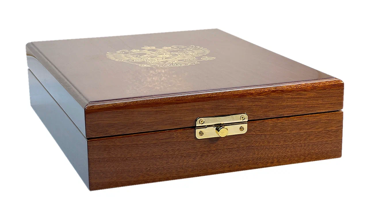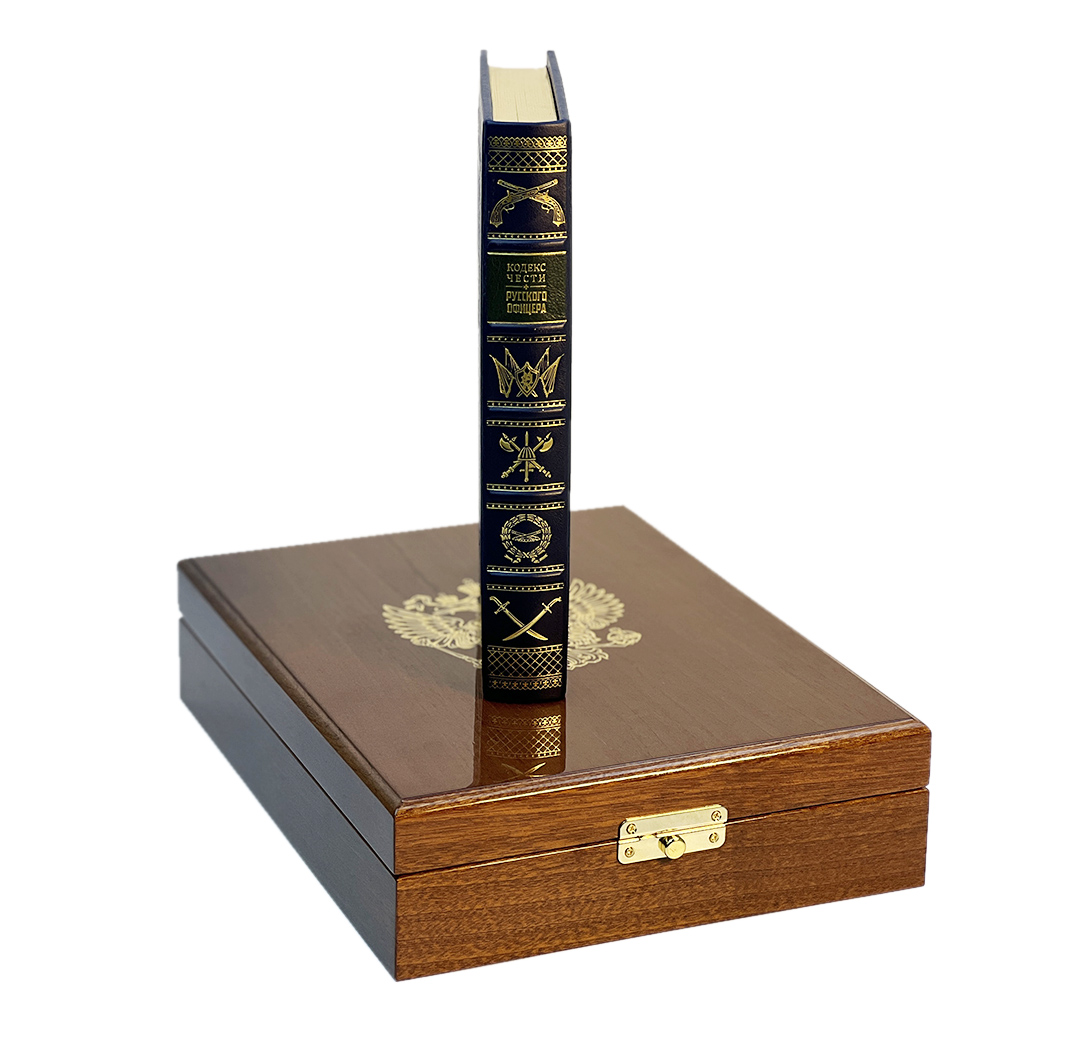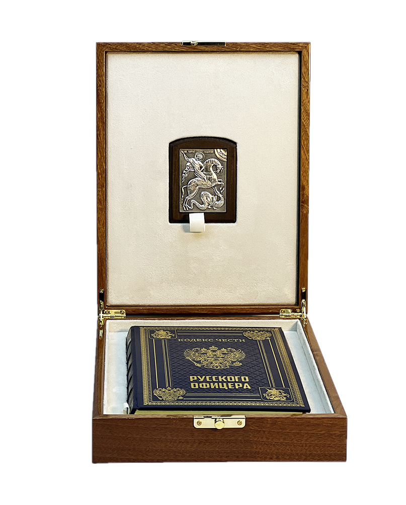 Оригинальный подарочный набор включает в себя книгу в кожаном переплете «Кодекс чести русского офицера» и икону «Св. Георгий Победоносец», оформленных в лакированной шкатулке, покрытой рояльным лаком и украшена золотым гербом из металлостикера.