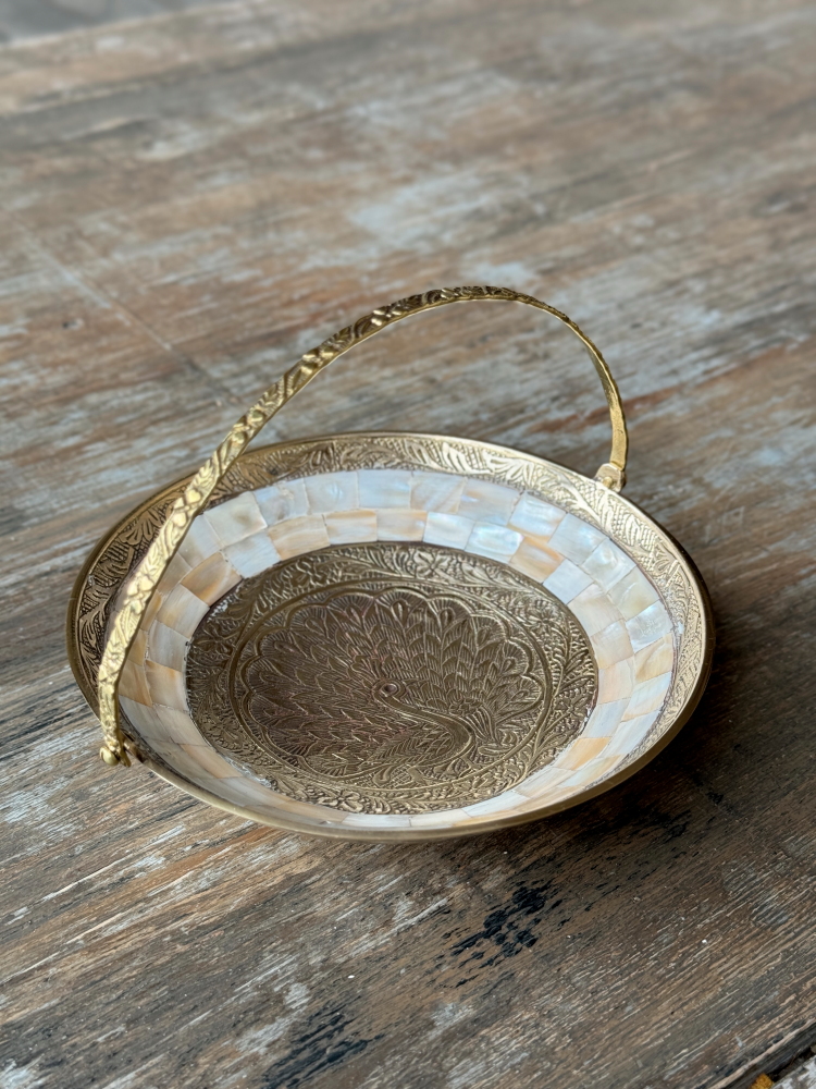 Конфетница с ручкой латунь резная белая эмаль 6.5"