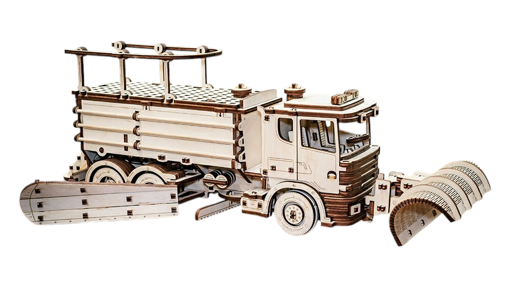 СНОУТРАК — механическая модель снегоуборочной машины. Конструктор с мощным резиномотором, поворотными передними колесами с удобным управлением на кабине, открывающимися дверцами кабины, тремя поворотными отвалами, съемным передним отвалом, откидным задним рассеивателем и складными поручнями.