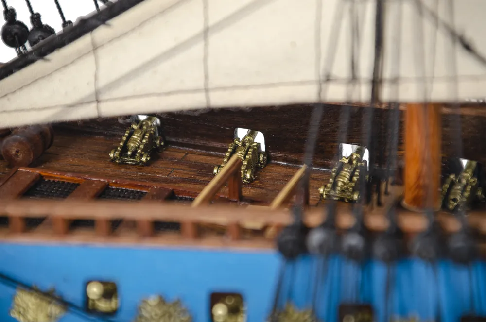 На его высоких фок - и грот- мачте впервые в отечественной практике появились паруса третьего яруса – брамсели. Корабль отличался хорошими мореходными качествами и имел мощное по тем временам артиллерийское вооружение. На нижней палубе (гон-деке) стояли 24 30 фунтовых орудия, на верхней (опер-деке) – столько же 16 фунтовых, на шканцах – 14 14 фунтовых, на баке (форкастеле) – два 2 фунтовых.