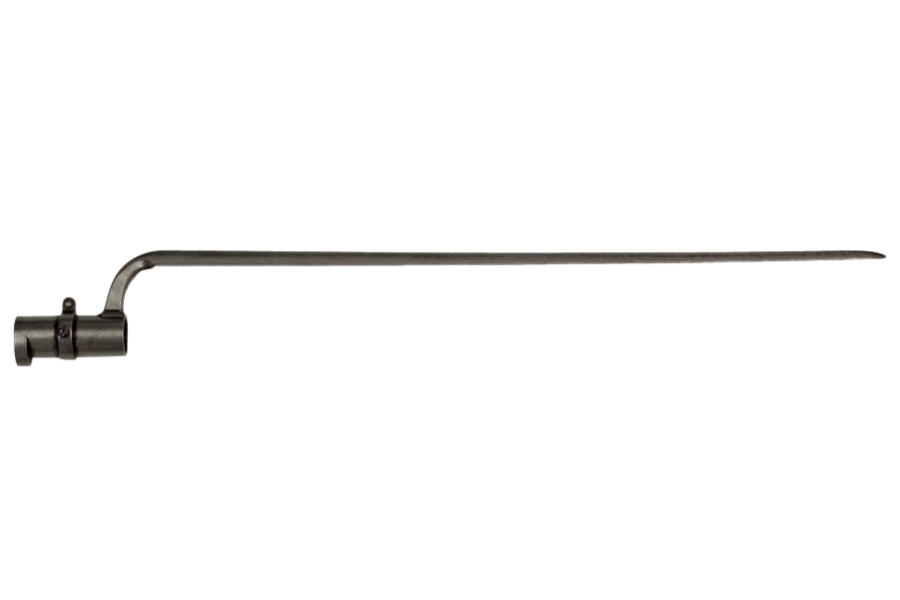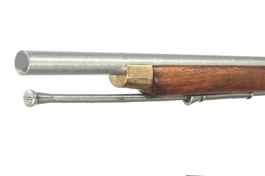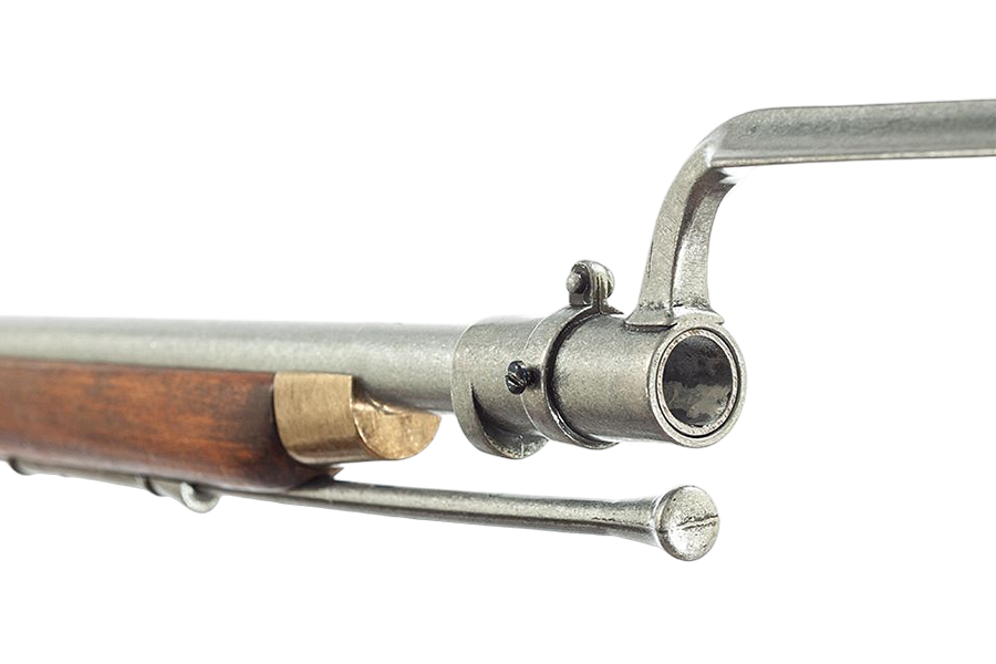 Часть элементов выполнены из латуни. Изделие с имитацией механизма зарядки и выстрела. Имеется штык, являющийся продолжением ствола (съемный)