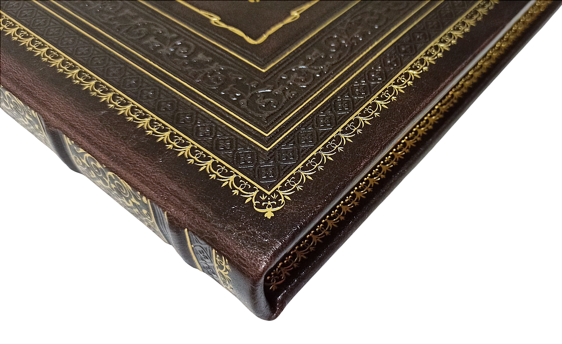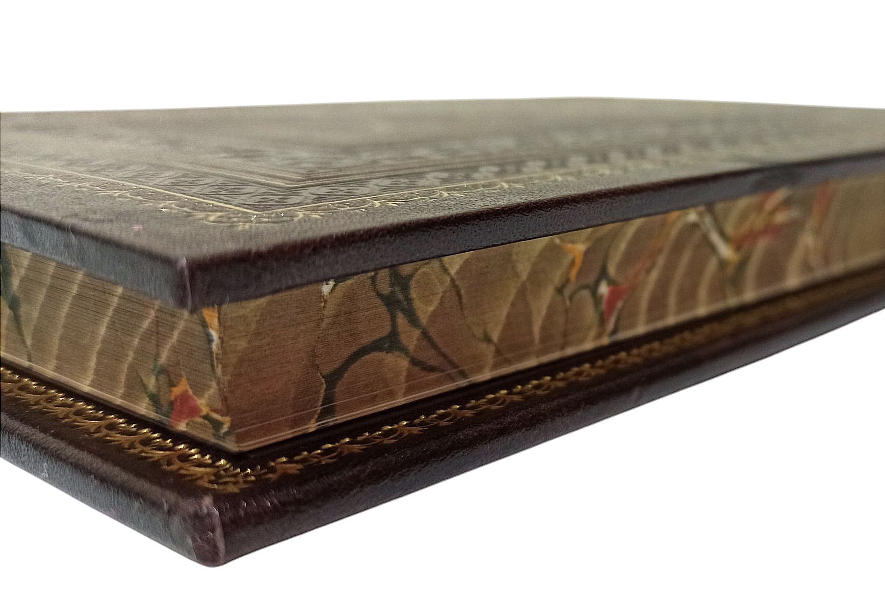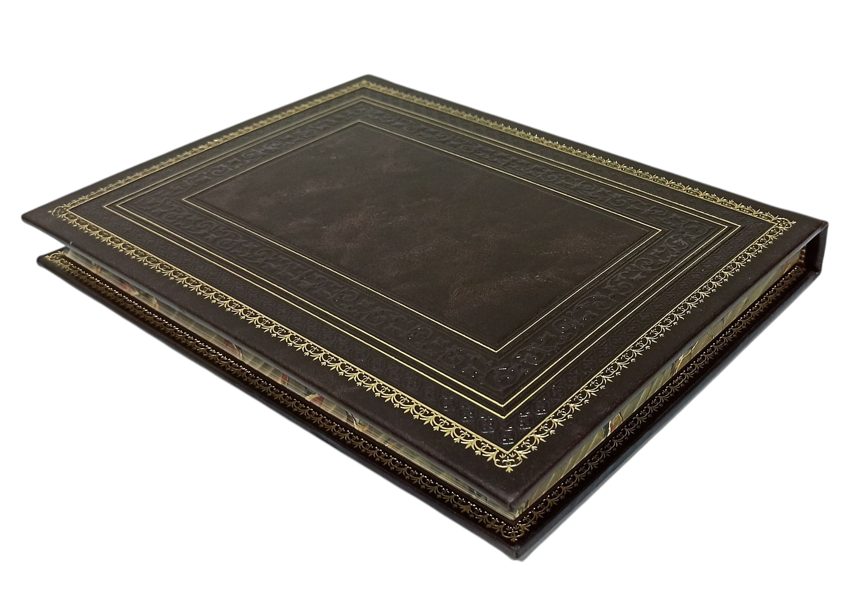 Цельнокожаный переплёт ручной работы, украшен золотым и блинтовым тиснением.