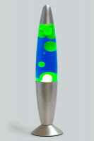 Настольная двухцветная лава-лампа с жёлтым воском и синей жидкостью, имеющая форму «ракеты», 35 см высотой на металлической подставке.