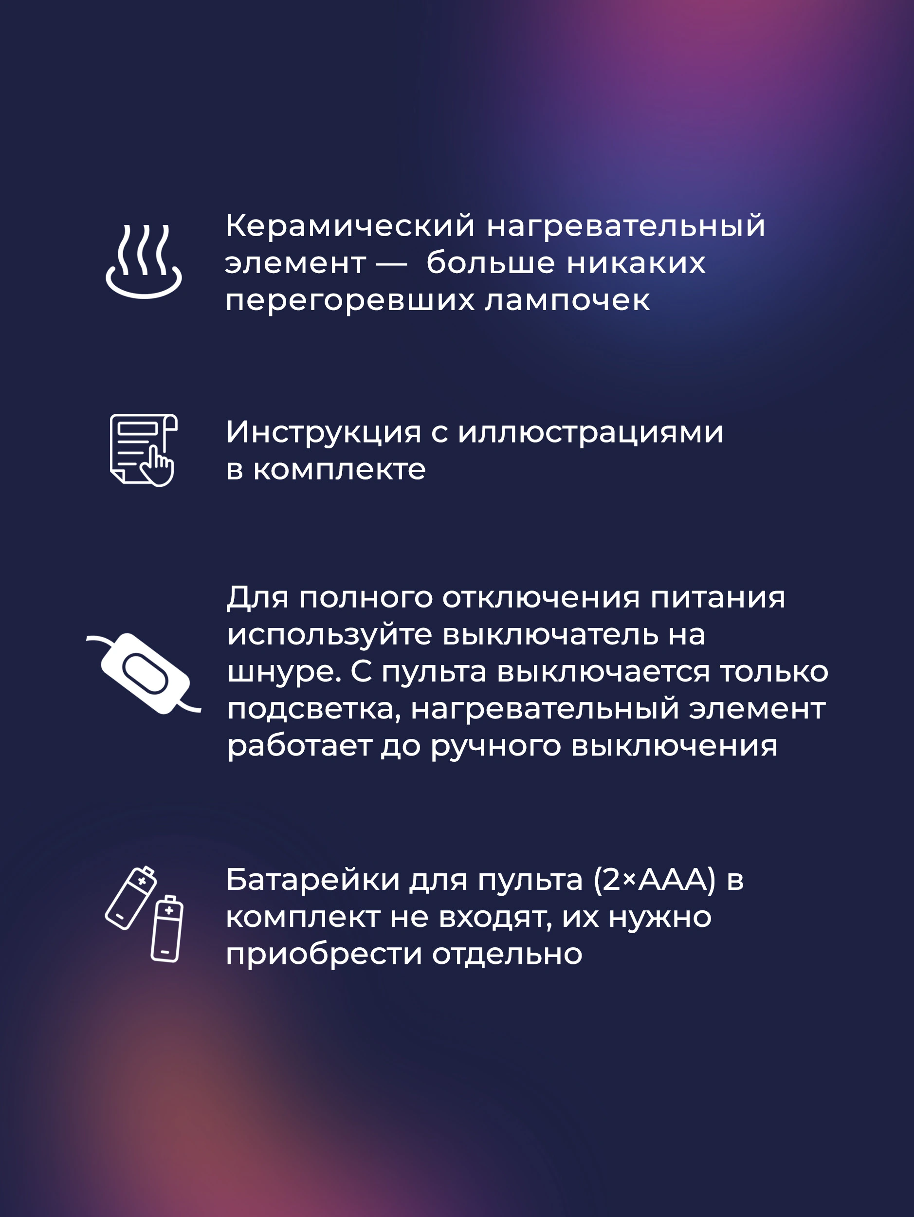 Выключатель на шнуре — для полного отключения питания. С пульта выключается только подсветка, нагревательный элемент работает до ручного выключения.