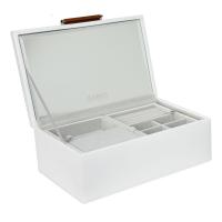 Большое удобное зеркало, валик для мелких драгоценностей, два малых отделения. Верхний ярус шкатулки можно использовать как дорожный футляр. Красивая внутренняя отделка из светлого велюра