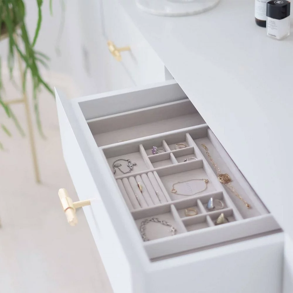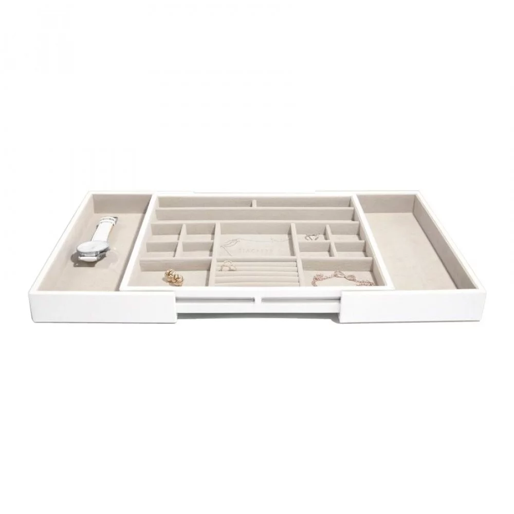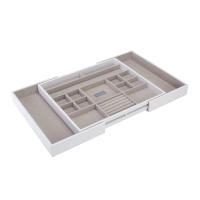 - В зависимости от количества украшений или размера ящика стола / полки, конфигурация лотка-слайдера может изменяться благодаря раздвижным боковым отделениям..