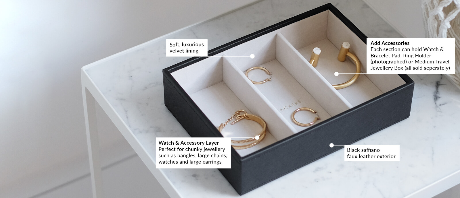 Серия Stackers - модульная коллекция, состоящая из шкатулок, лотков и органайзеров и позволяет "достраивать" этажи шкатулки по мере возрастания количества Ваших украшений.