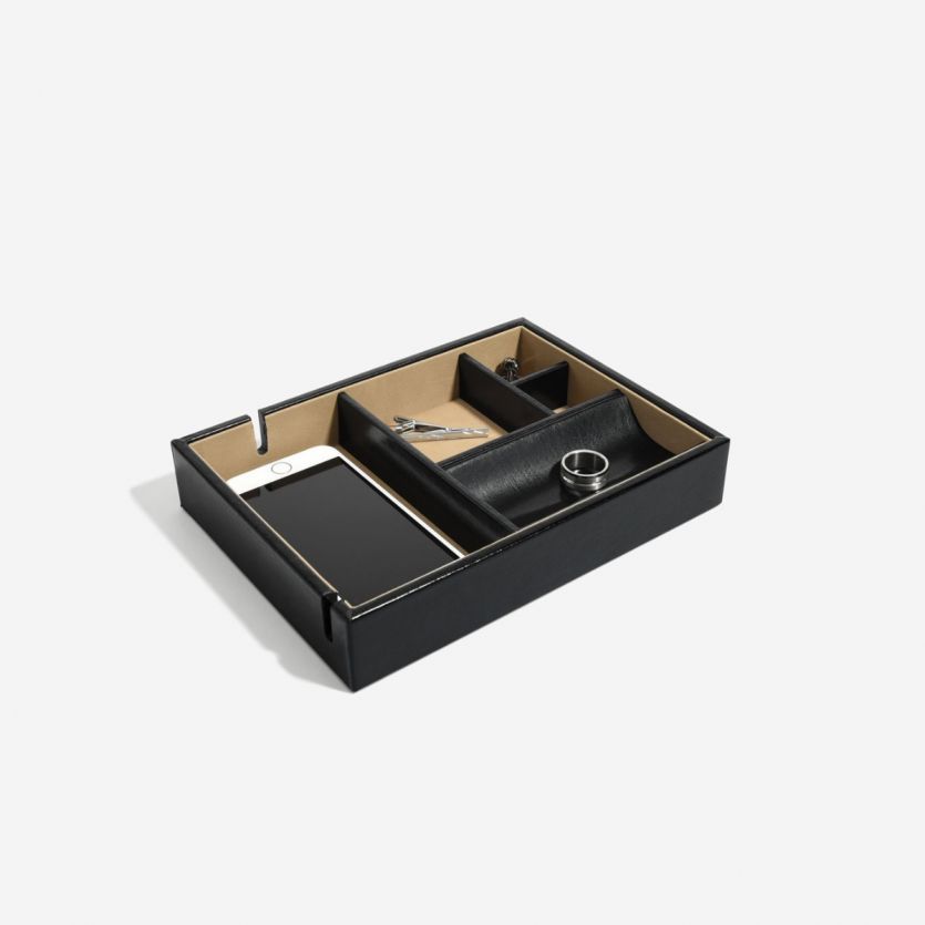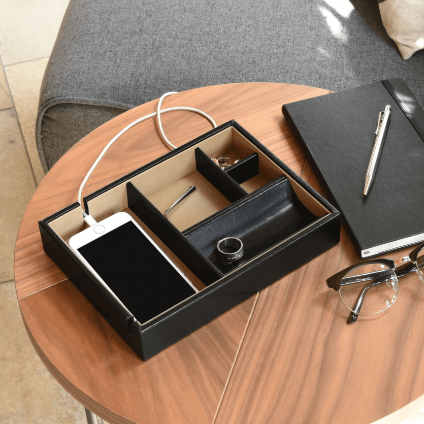 Данная модель подойдет для хранения различных аксессуаров, таких как телефон либо бумажник, очки, часы, запонки, кольца или цепочки.