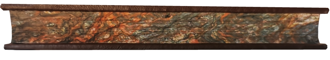 Цельнокожаный переплёт ручной работы, украшен вставкой из цветного металла с золотой печатью.Блинтовое и золотое тиснение.
