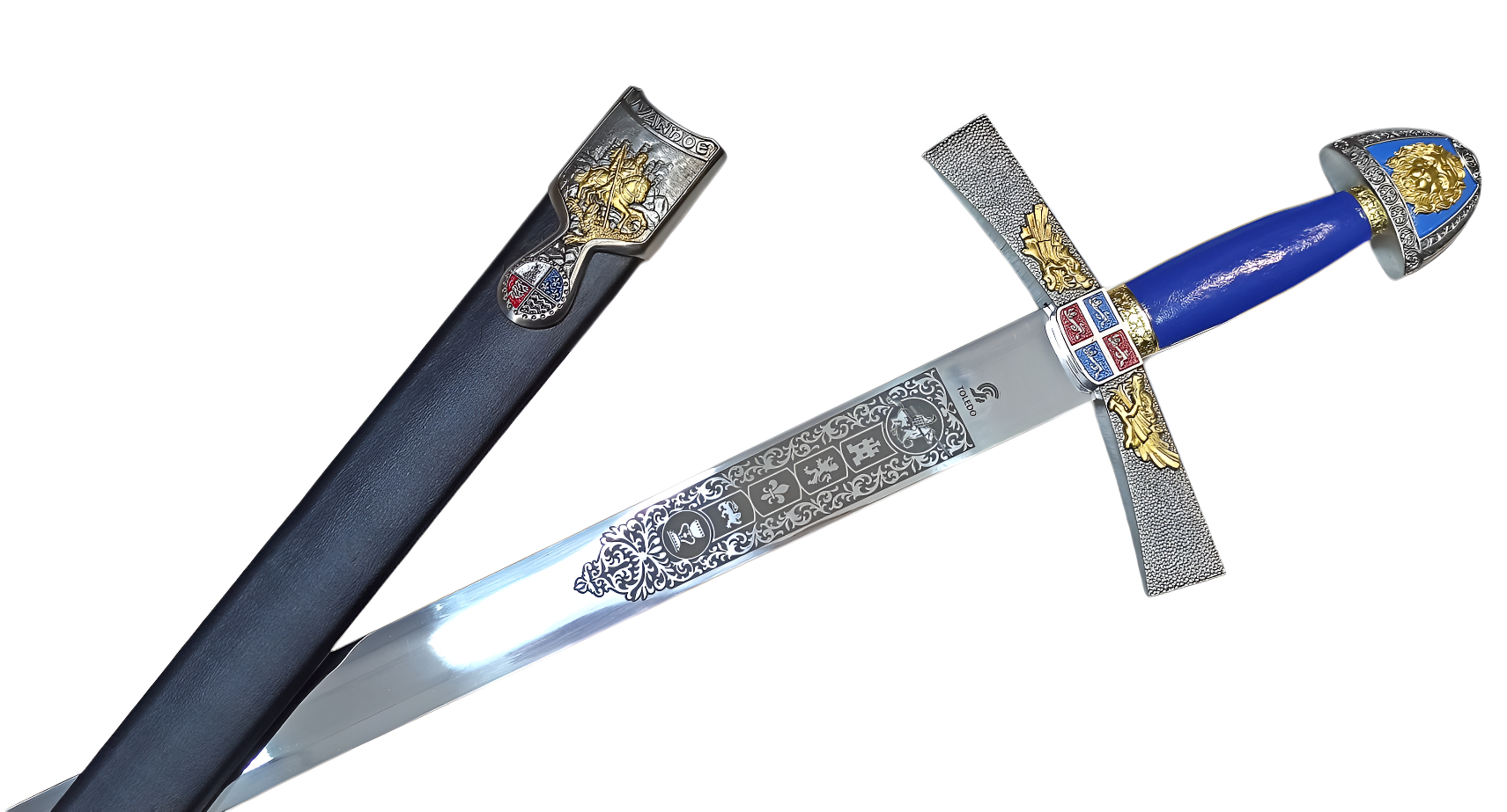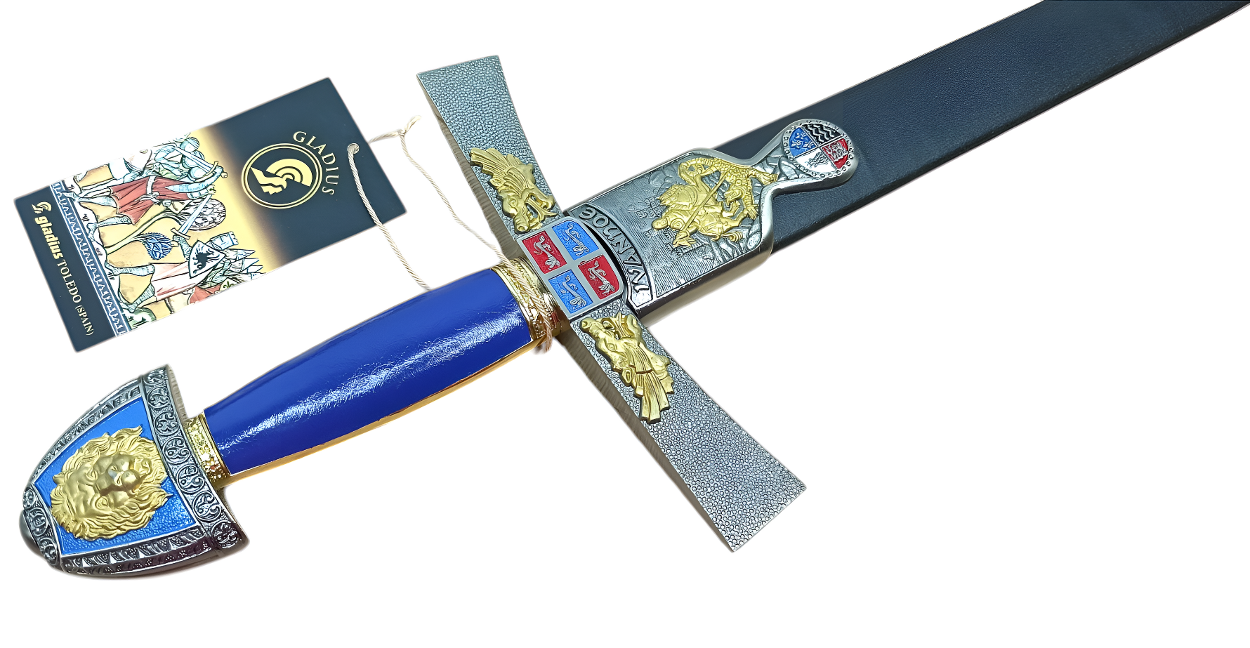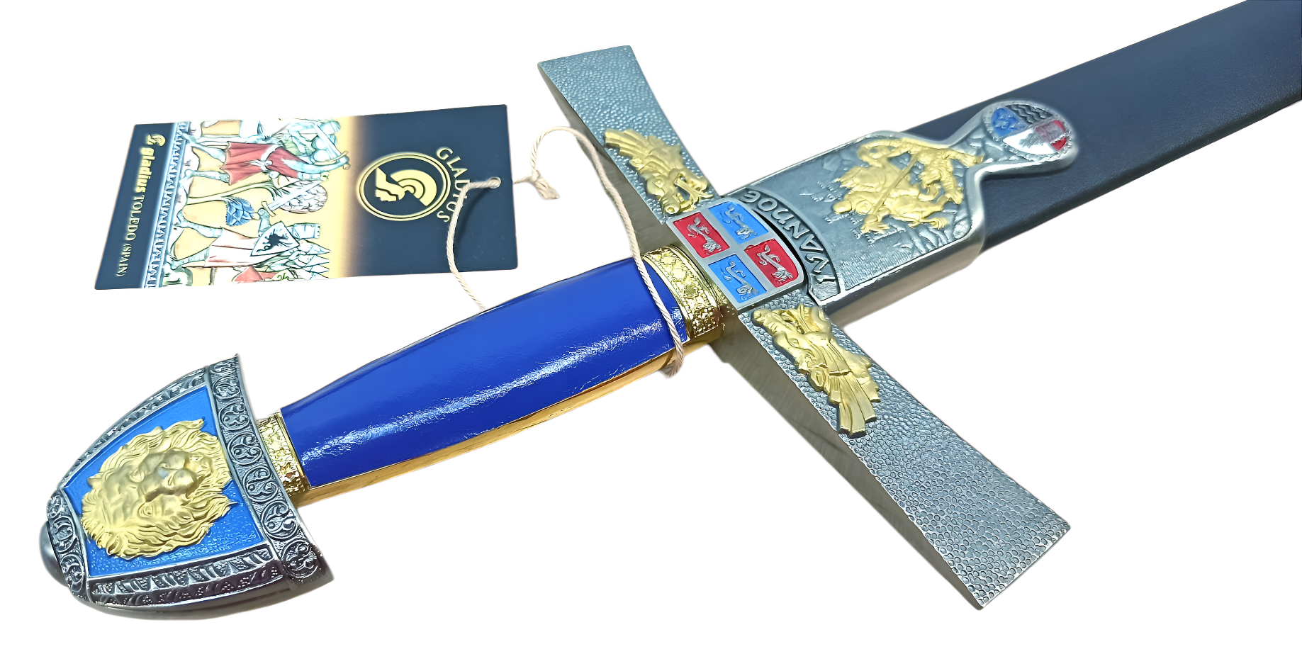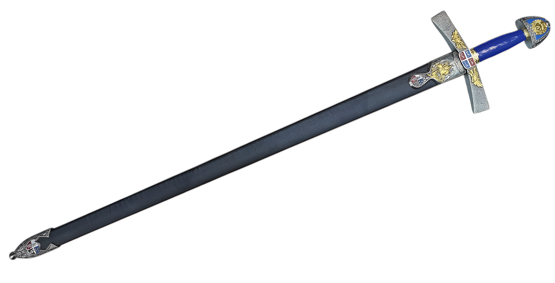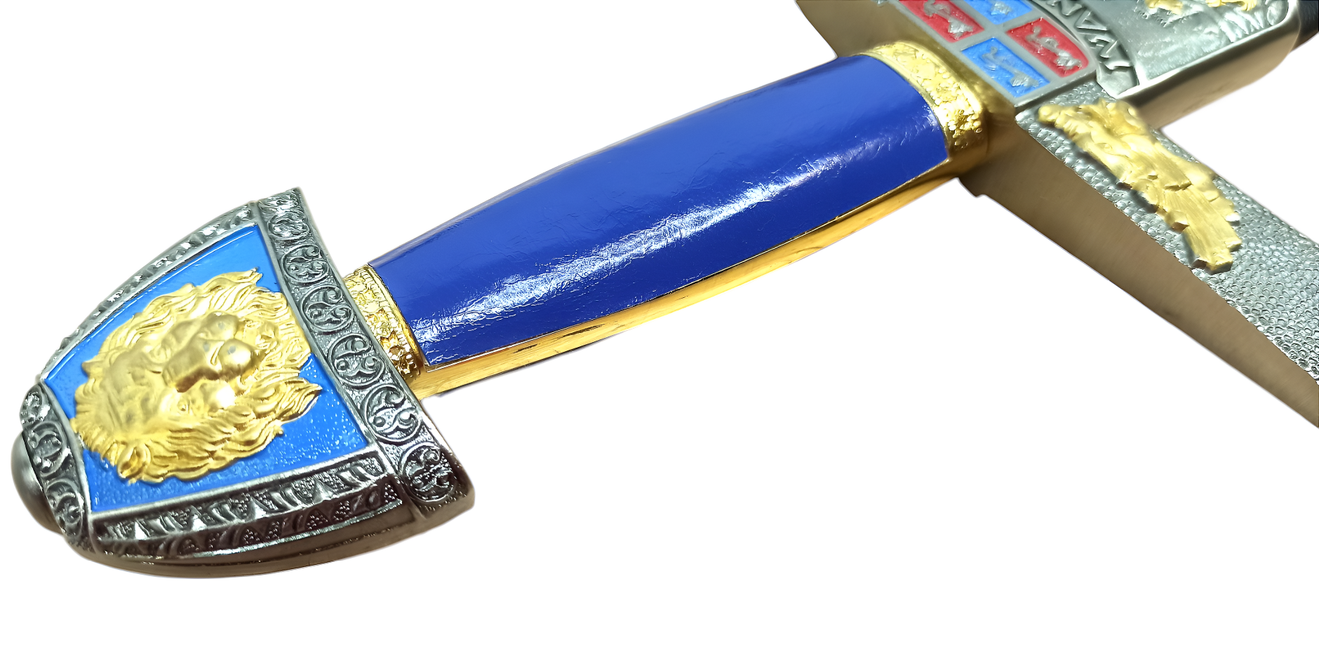 Меч "Айвенго" не просто оружие, это произведение искусства. Его рукоять, изготовленная из старинной латуни и украшенная навершием в виде головы льва, обвитой синей кожей, олицетворяет мощь и благородство. Гарда, украшенная геральдическим щитом и головами саксонских драконов, добавляет мечу рыцарского шарма и элегантности.