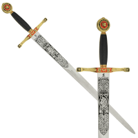 Эфес меча "Эскалибур" украшен кельтскими узорами и геральдическими драконами как на навершии, так и на гарде, а на лезвии меча из нержавеющей стали нанесены красивые гравировки. Эфес золотого цвета. На большом круглом навершии нанесена надпись "EXCALIBUR • KING ARTHUR" вокруг крылатого дракона. Лезвие изготовлено из нержавеющей стали имеет блестящую зеркальную полировку и глубоко выгравированное в черном цвете изображение короля Артура с кельтскими узорами и драконами, и надписью сверху "EXCALIBUR". На каждом клинке нанесена подлинная печать Толедо.