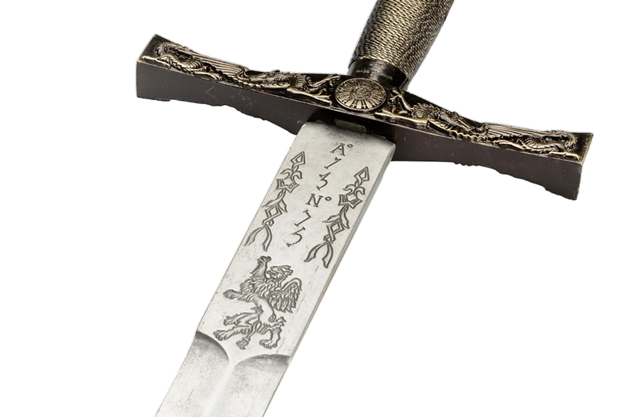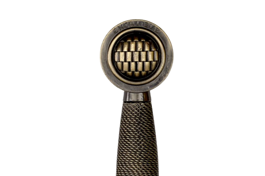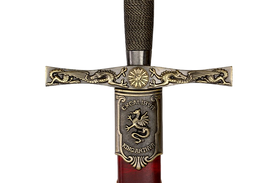 Макет меча выполненный из металла. Для изготовления эфеса использовалась латунь. Навершие круглой формы с надписью "Excalibur". Гарда имеет крестообразную форму, и украшена гравировкой с изображением драконов. Черенок с имитацией проволочной обмотки. Клинок меча украшен гравировкой.
