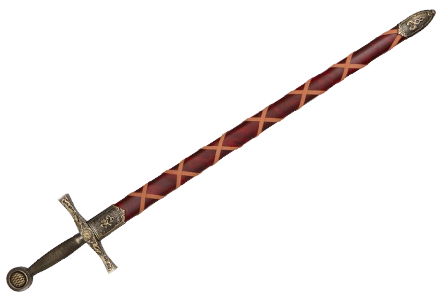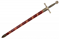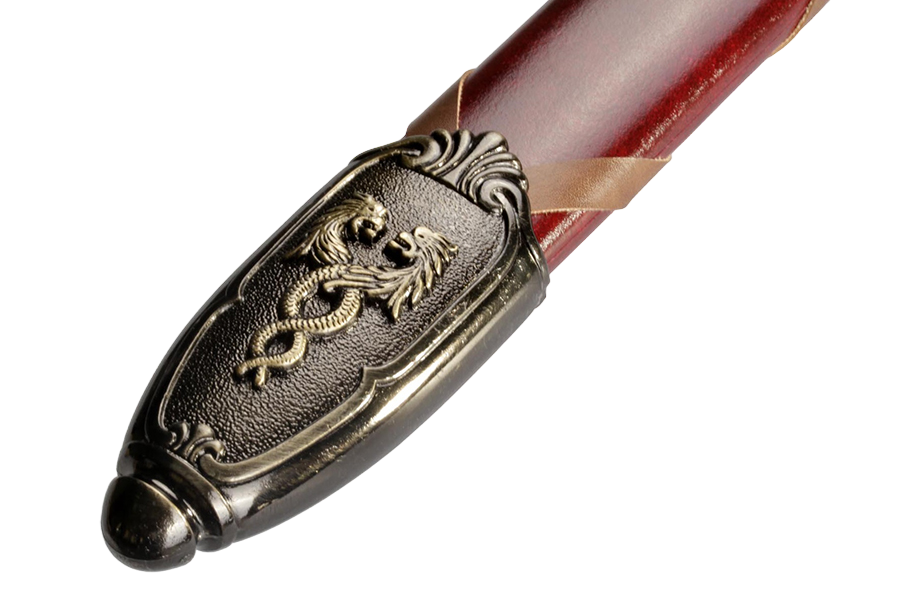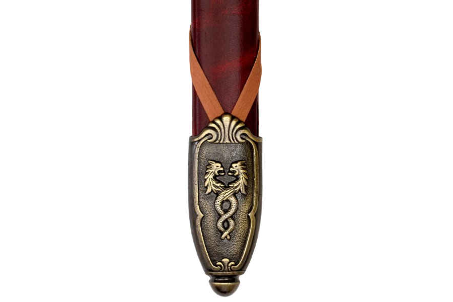 Ножны выполнены из пластика и обтянуты экокожей коричневого цвета. Украшены оплеткой из светло-коричневой экокожи и металлическими элементами на устье и наконечнике. На устье ножен красуется крылатый дракон и надпись "Excalibur. King Arthur".
