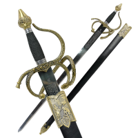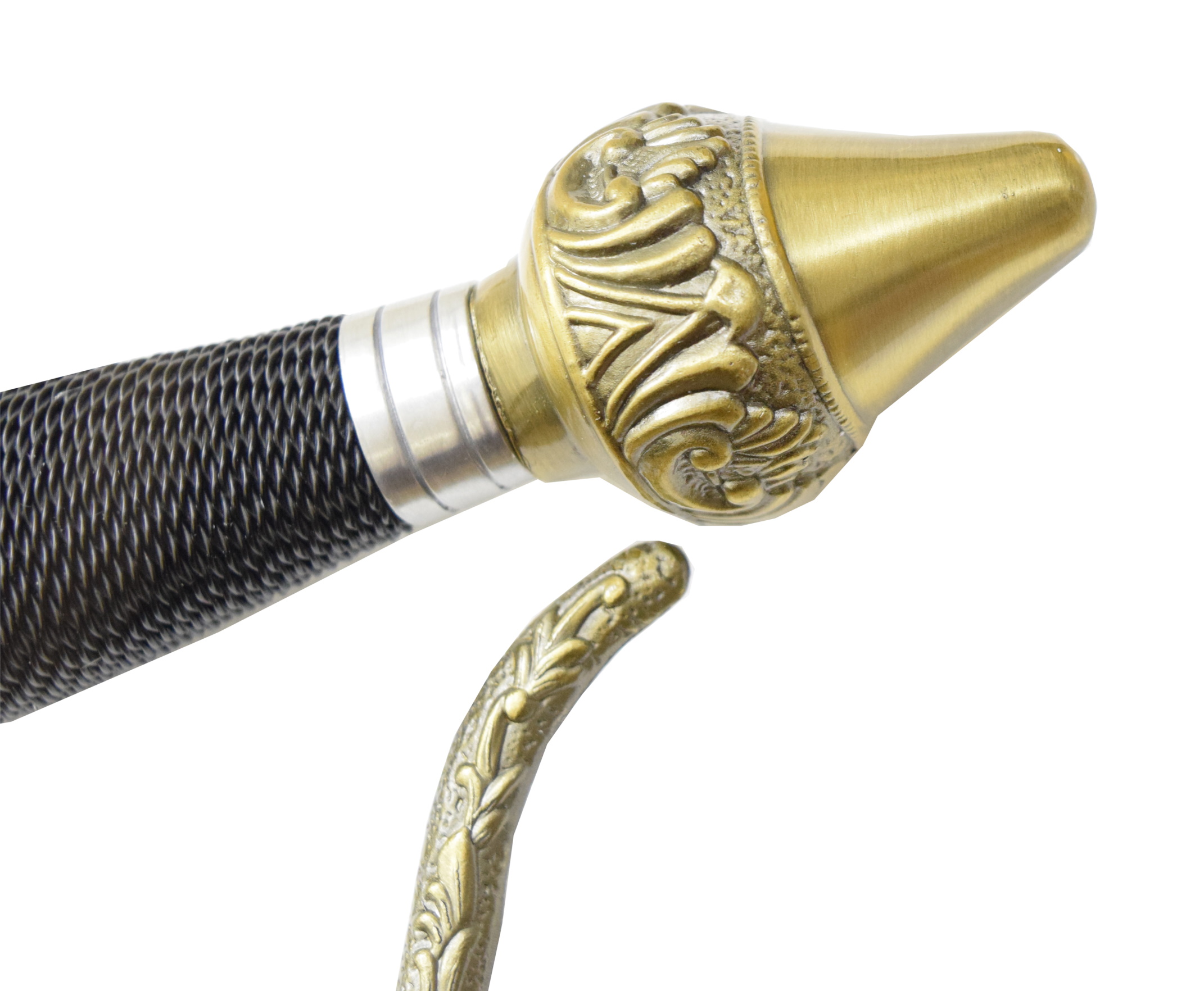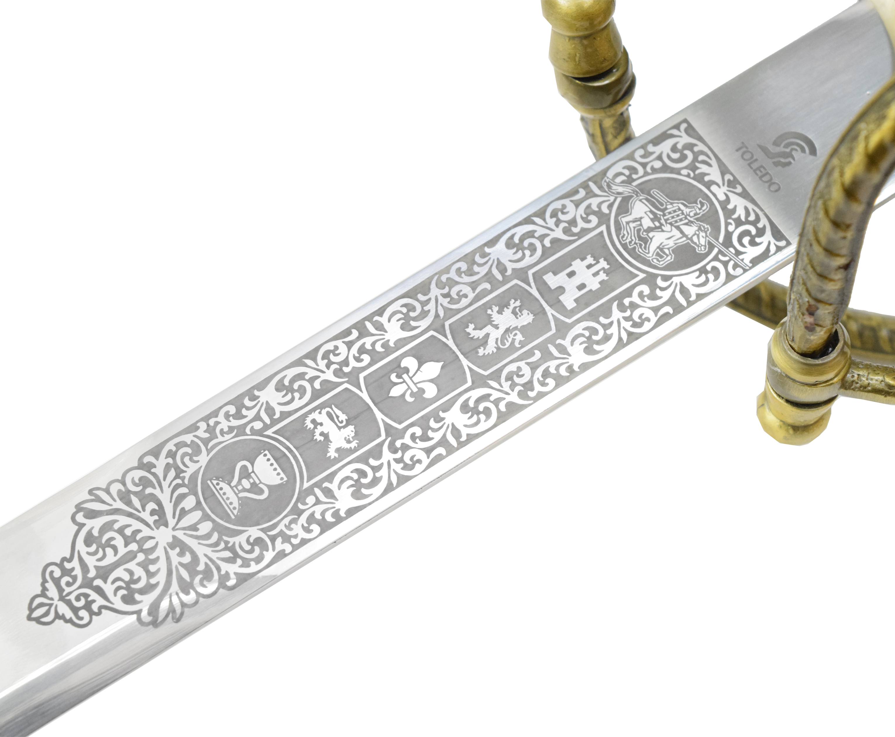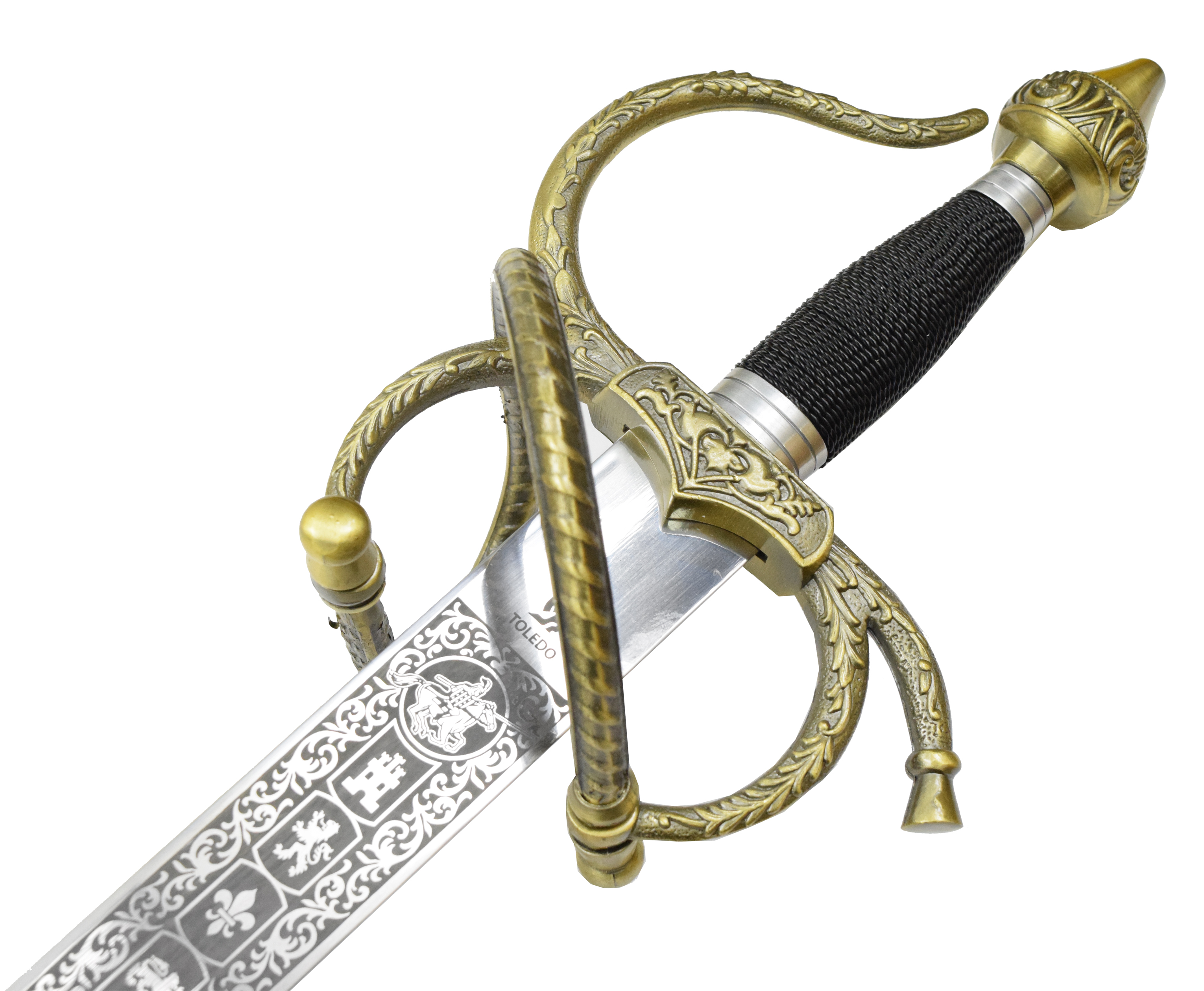 Меч "Колада Дель Сид" с черенком, обмотанным проволокой, и витиеватой гардой. Лезвие изготовлено из нержавеющей стали с высокотехнологичной обработкой (полировкой) и не заточено. На лезвие присутствует гравировка.