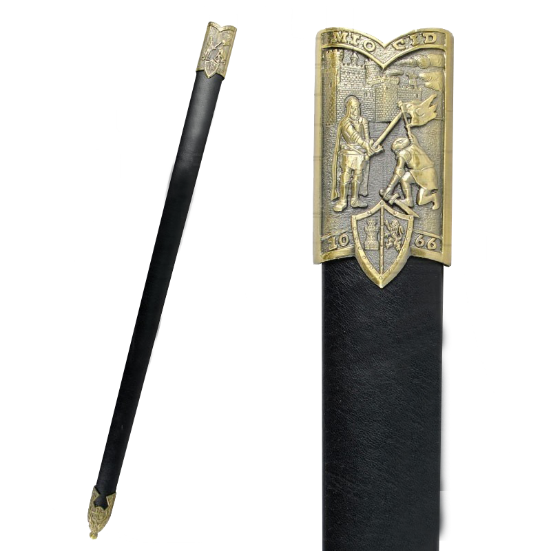 Ножны с кожаной отделкой черного цвета. На устье ножен отчеканен момент победы Эль Сида над Букаром и надпись «Mío Cid, 1066» (Мой Сид, 1066). Наконечник украшен изображением герба.