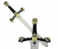 Церемониальный парадный меч Александра Македонского в отделке "под золото". За основу был использован древнегреческий меч Ксифос (Ксифос, иногда зифос - прямой обоюдоострый меч длиной около 60 см; остриё ярко выраженное, клинок листообразный). На навершие эфеса изображены колесничии и гоплиты. Черенок обтянут кожей черного цвета. Концы гарды сделаны в виде головы льва, а в центре расположилась голова Медузы Горгоны. Лезвие изготовлено из нержавеющей стали с высокотехнологичной обработкой (полировкой) и не заточено. Имеет глубокий желоб, идущий по центру меча.